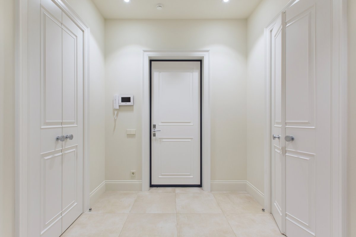 Нашему вниманию представлен коридор с белыми дверями. В этом пространстве все элементы оформления гармонично сочетаются, создавая атмосферу светлой и уютной обстановки. Белые двери добавляют в интерьер нотку стильной элегантности и придают помещению чистоту и свежесть. Коридор с белыми дверями является идеальным выбором для тех, кто ценит минимализм и простоту в оформлении интерьера. Присмотритесь к фотографии ниже и вдохновитесь этим стильным и функциональным решением!
