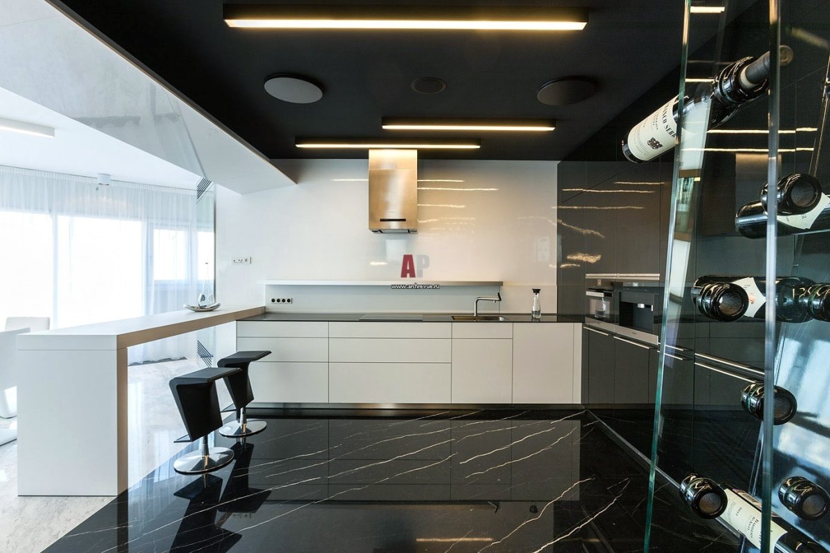 62. Черный натяжной потолок на кухне