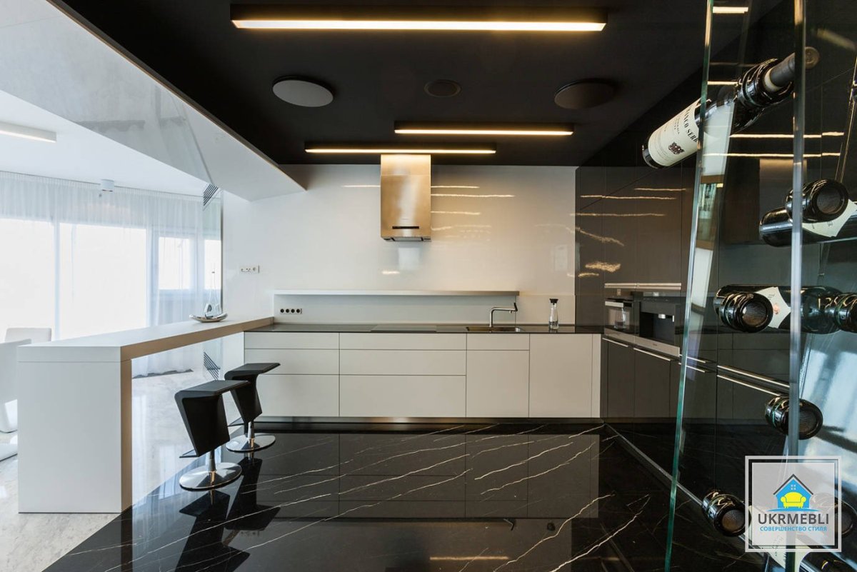 64. Кухни с чёрным потолком и белой мебелью
