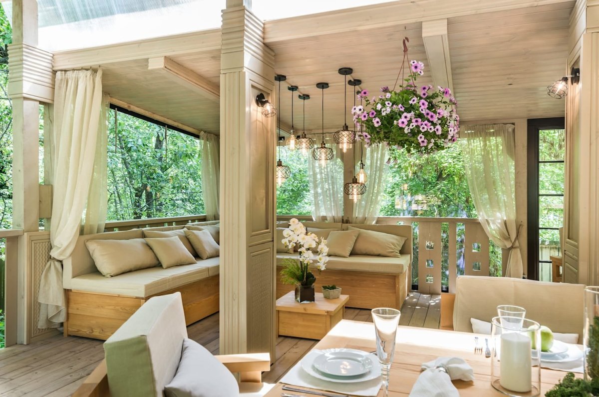 Беседка с потолком из мешковины представляет собой уютное и стильное место отдыха на свежем воздухе. Текстурные нити мешковины придают особый шарм этому потолку, создавая атмосферу природной элегантности. Они также способствуют хорошей вентиляции и позволяют проникать свету, создавая приятную игру теней под крышей. Благодаря своей прочности и устойчивости к внешним воздействиям, потолок из мешковины будет долго служить и радовать вас своим оригинальным видом.