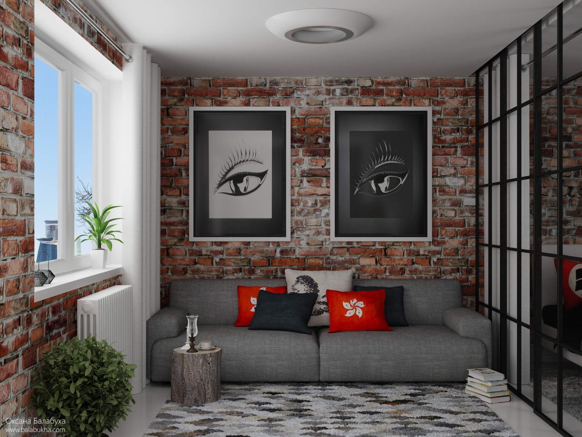 8. Зал в хрущевке в стиле лофт