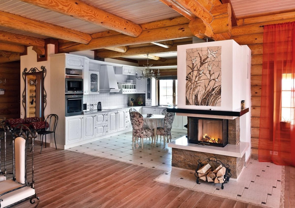49. Кухня с камином в деревенском стиле