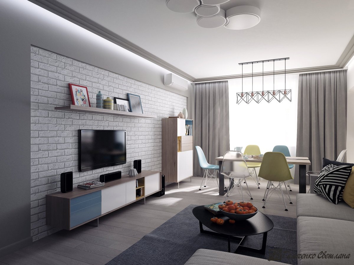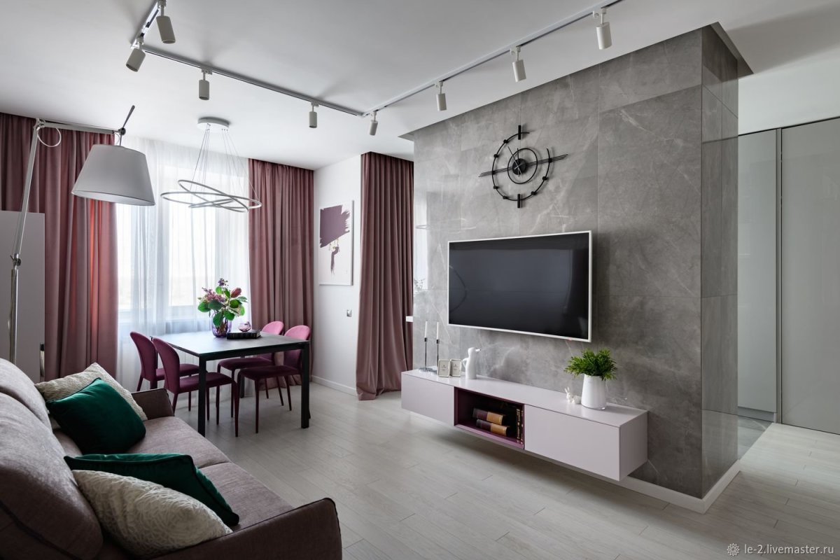 26. Гостиная серые стены телевизор