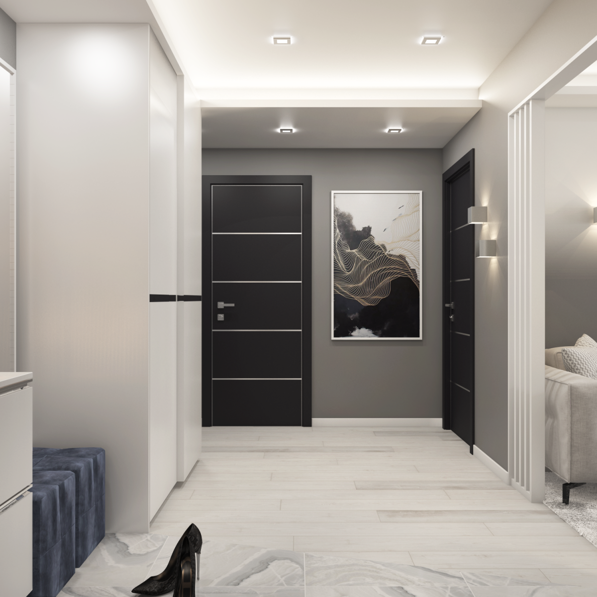 14. Серая прихожая с белыми дверями