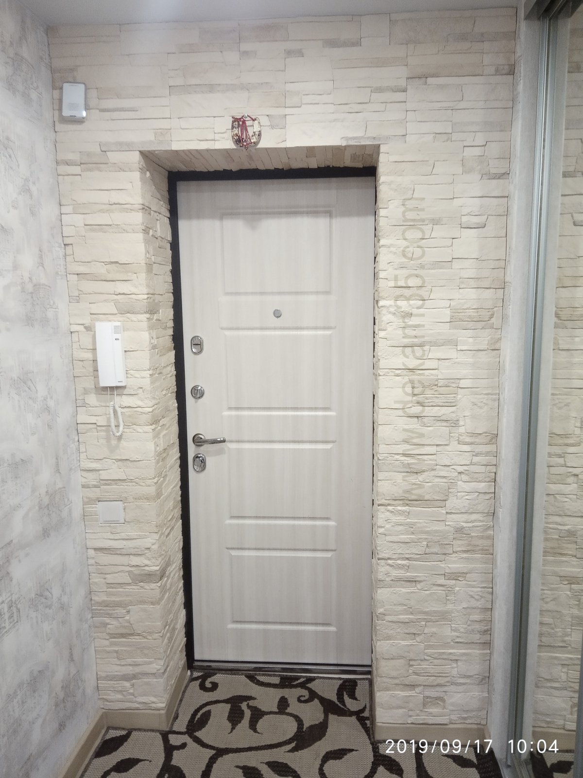 6. Отделка входной двери декоративным камнем в прихожей