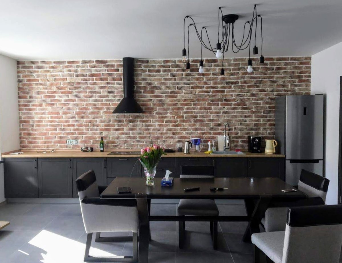 12. Серая кирпичная стена в интерьере кухни