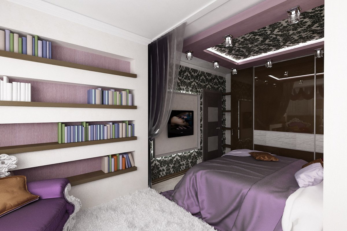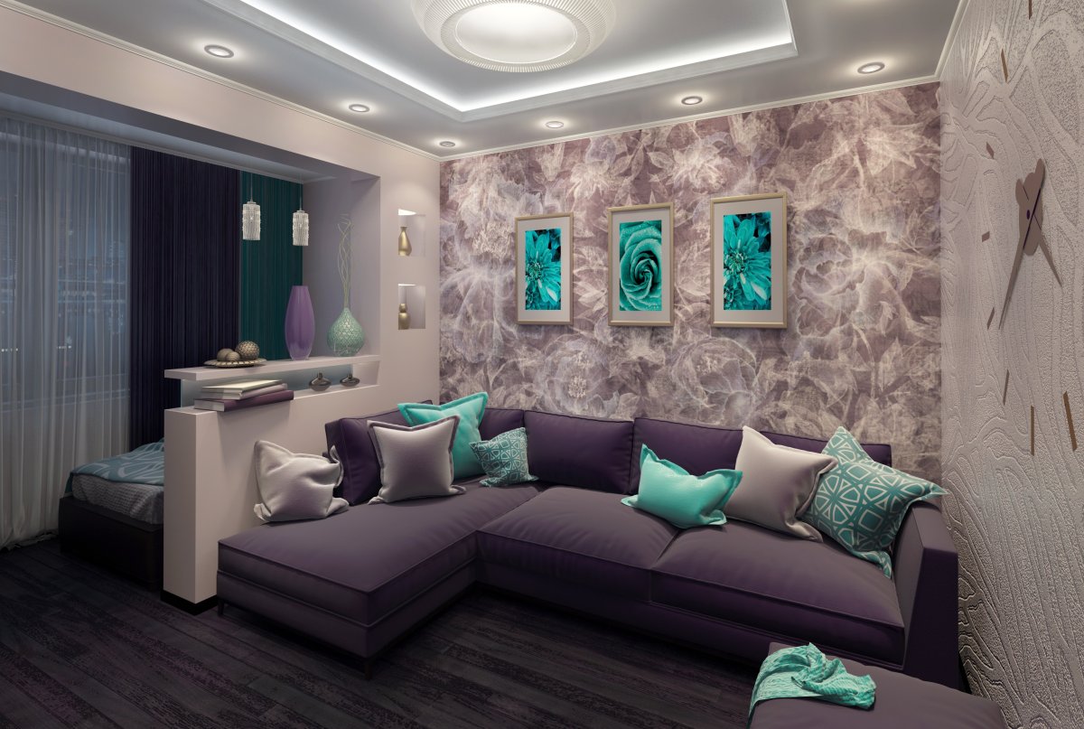 12. Совмещенная спальня гостиная с фиолетовыми