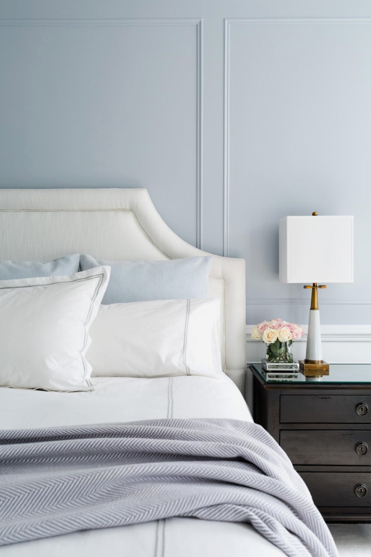 44. Светлая серо-голубая спальня современная классика