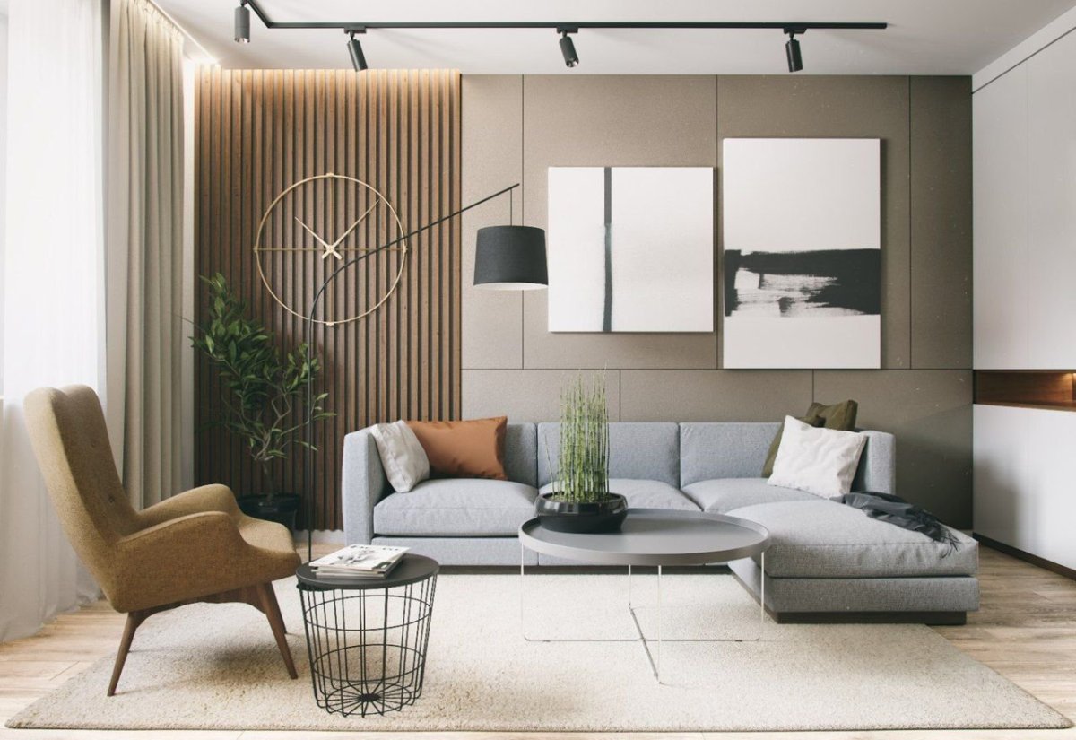 13. Гостиная в современном стиле с рейками