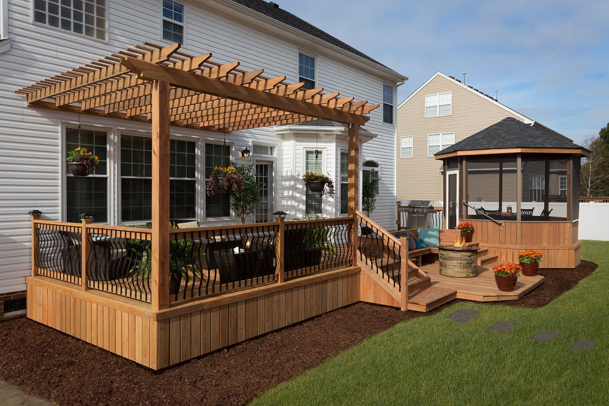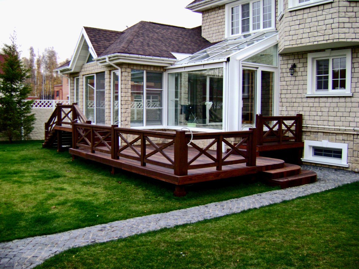 10. Деревянная терраса к кирпичному дому