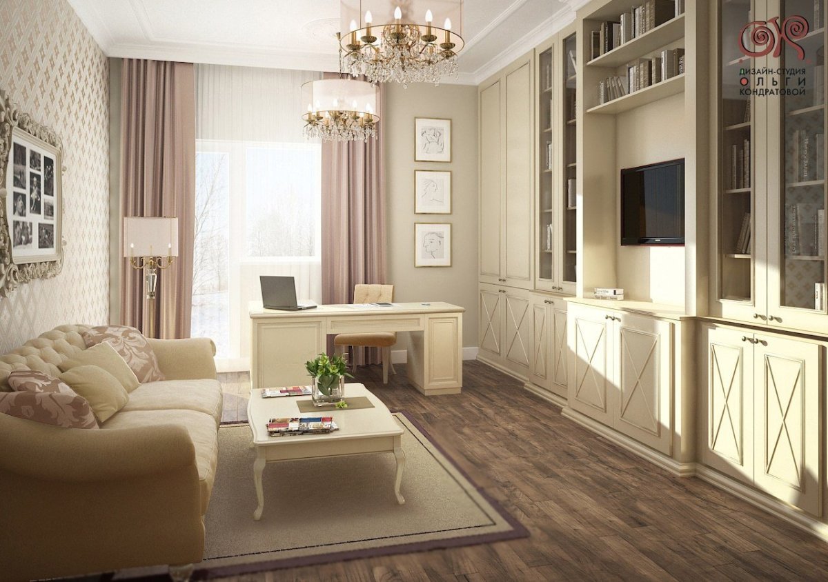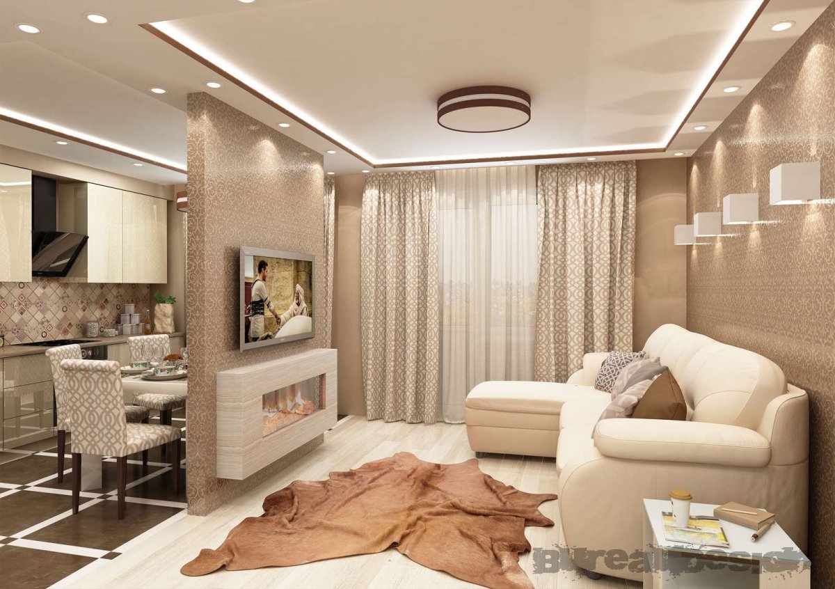 56. Дизайн гостиной в бежево молочных тонах с камином