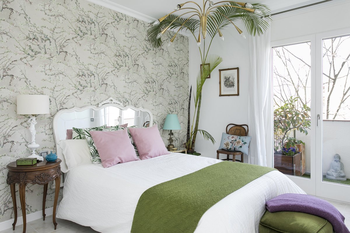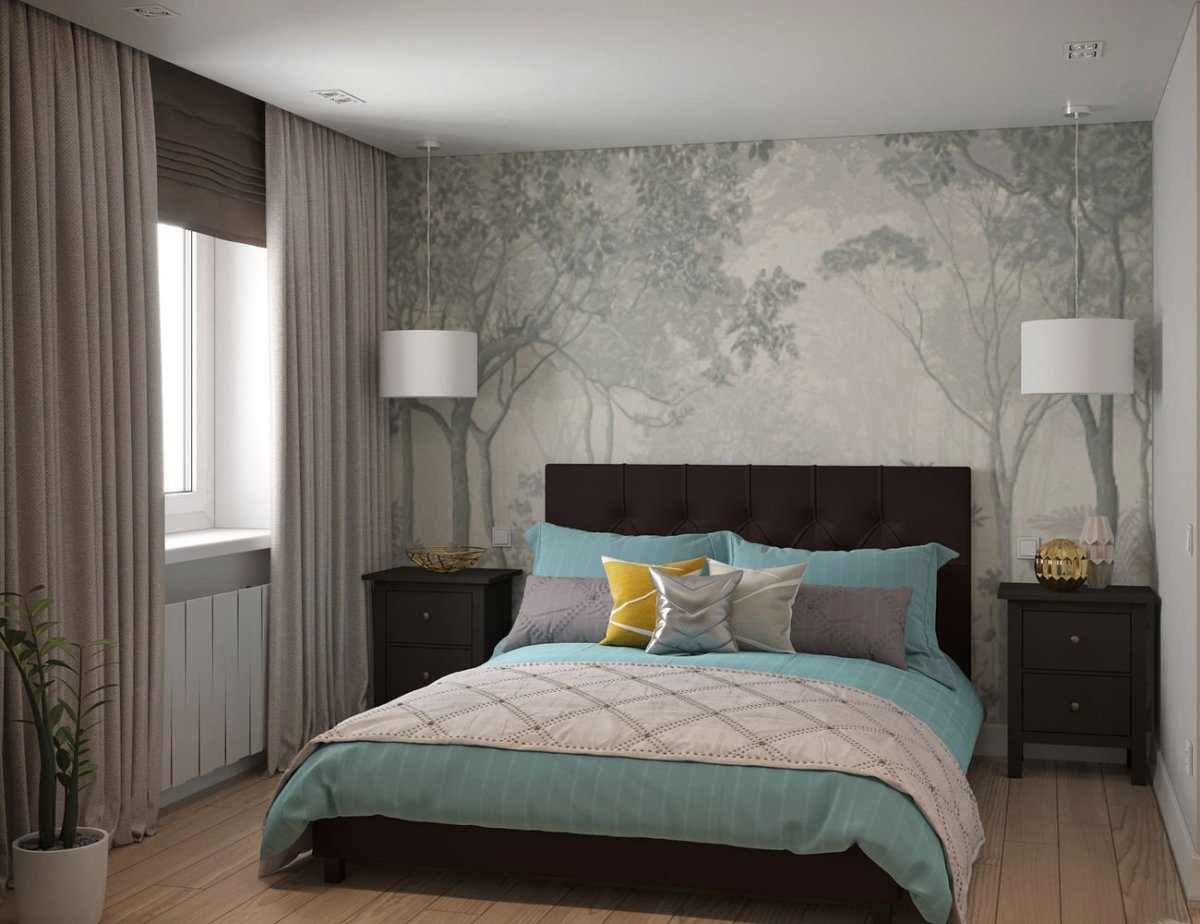 3. Обои с листьями пальм в бежевом цвете в интерьере спальни