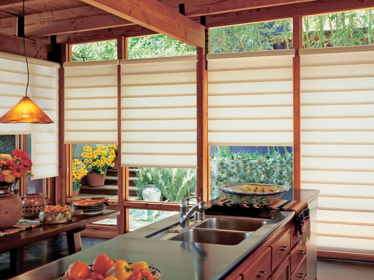 8. Римские шторы на кухню в деревянном доме