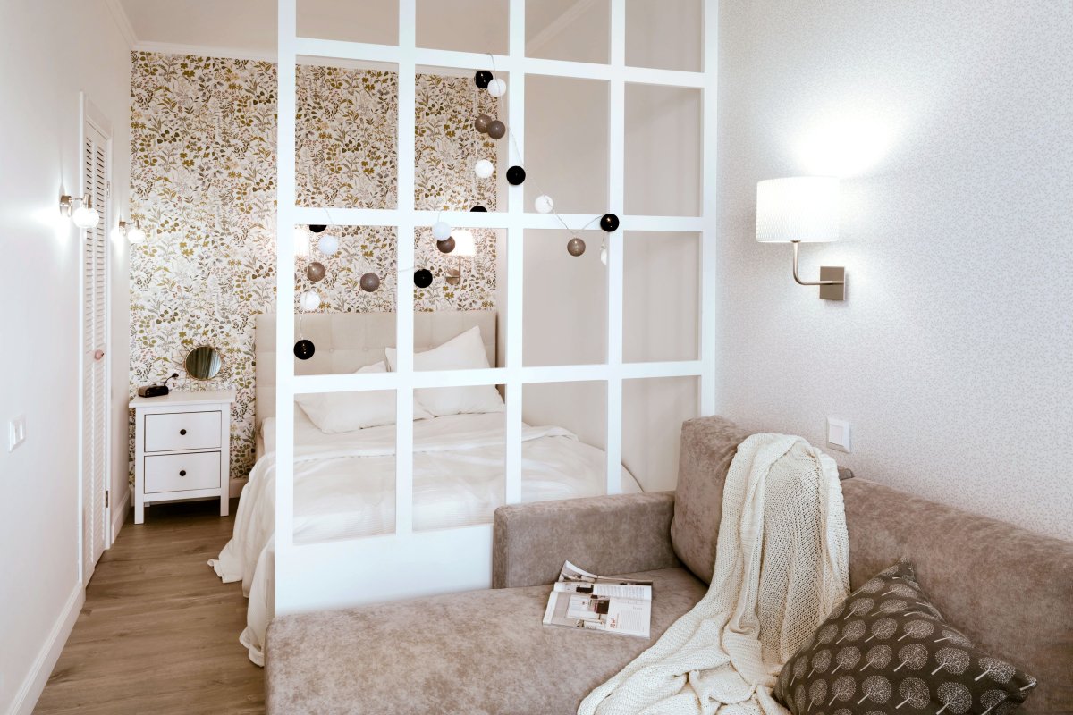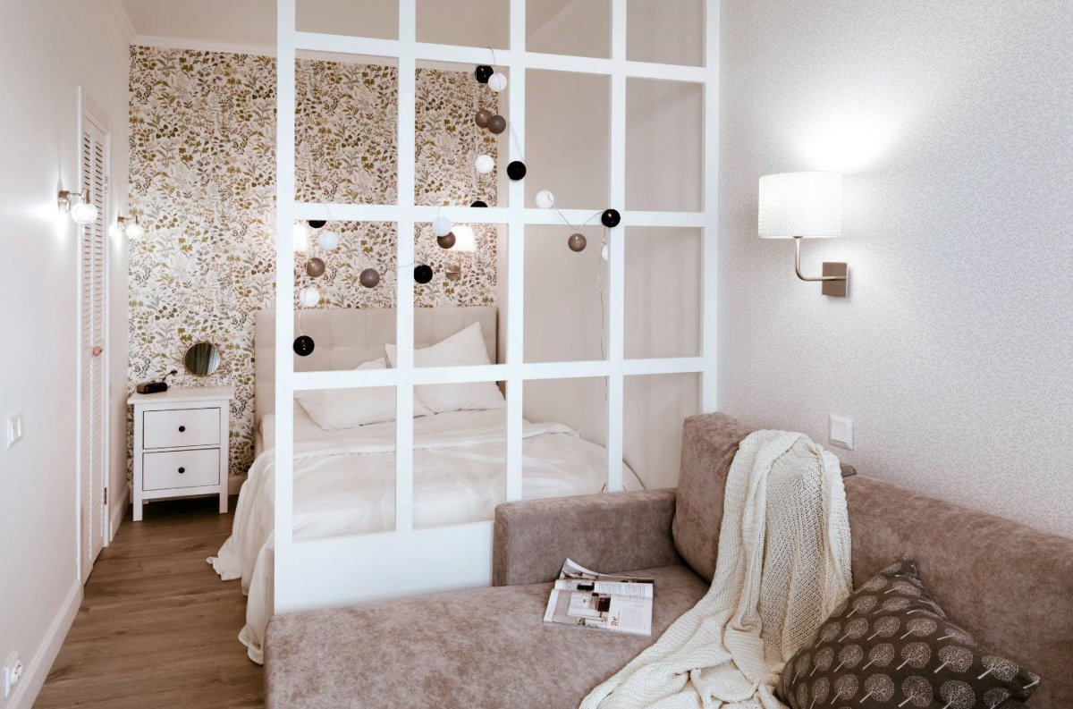 44. Зонирование на спальню и гостиную стеклянной перегородкой