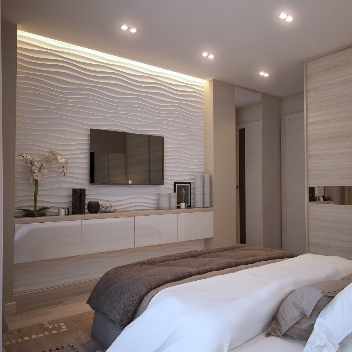 59. Декор стены с телевизором в спальне