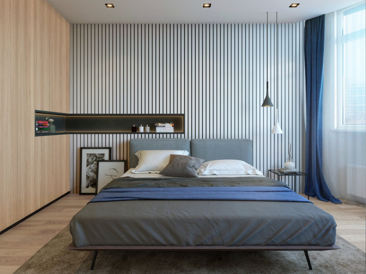 4. Серо зеленый интерьер спальни с деревянными рейками