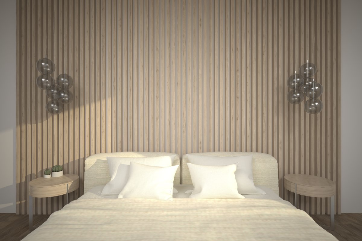 2. Спальня с деревянными рейками на стене