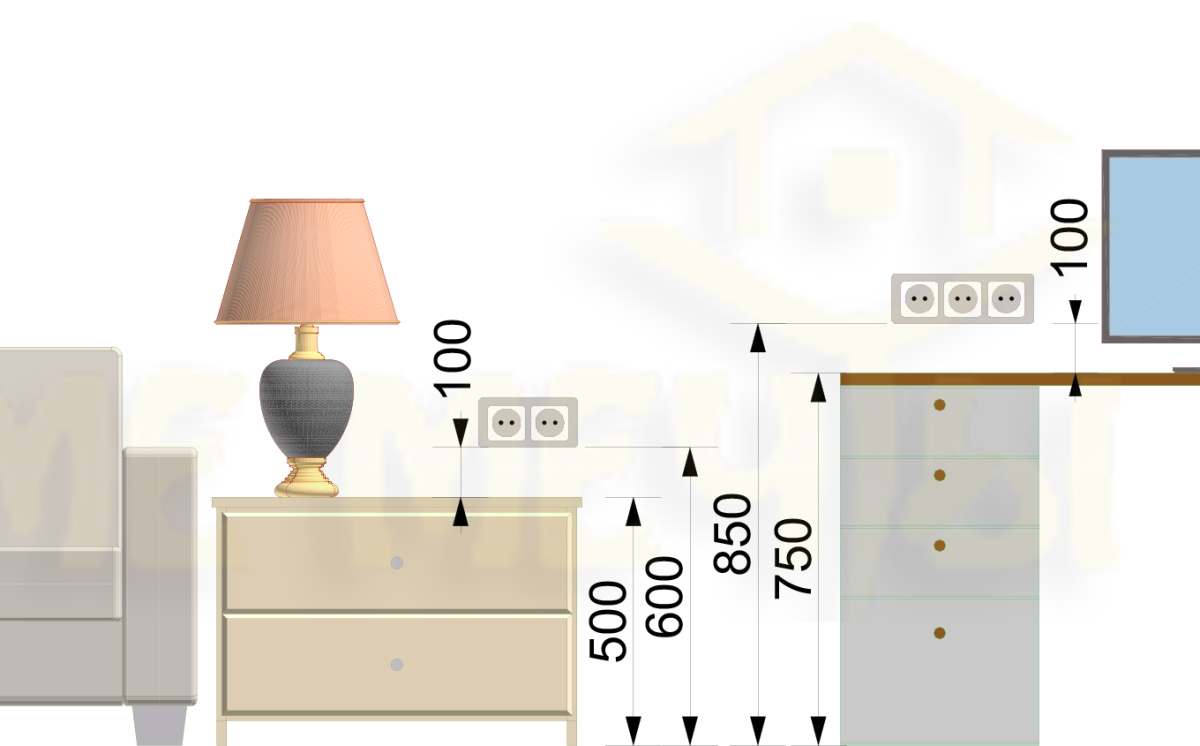 62. Высота прикроватных тумбочек стандартная и расположение розеток