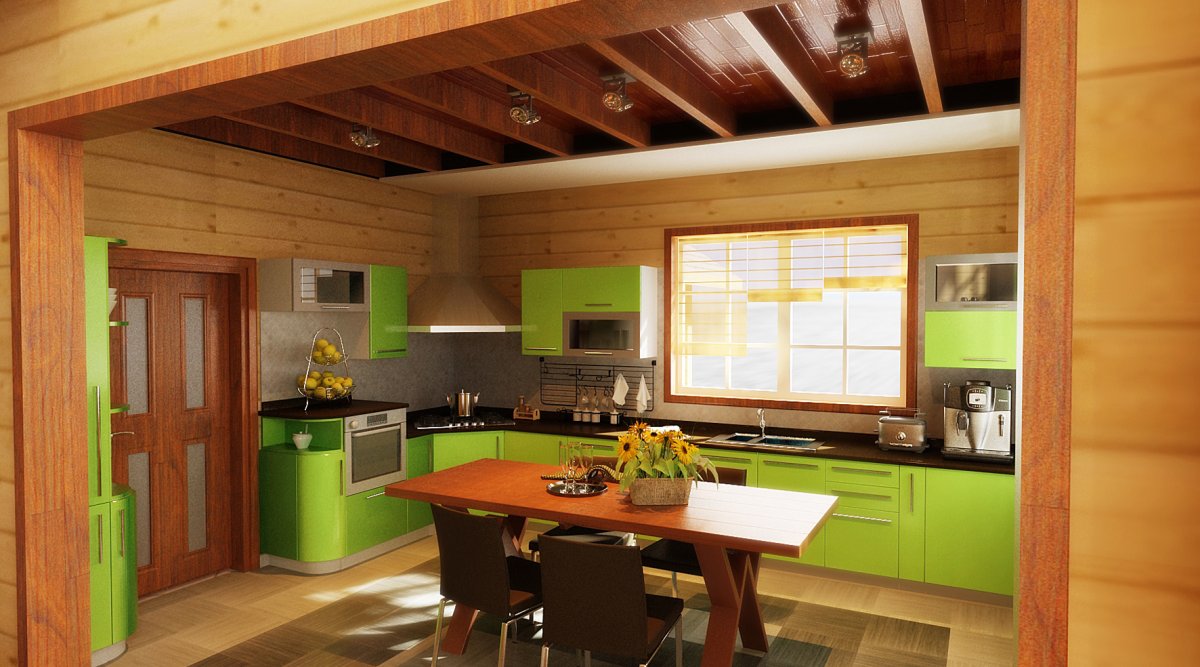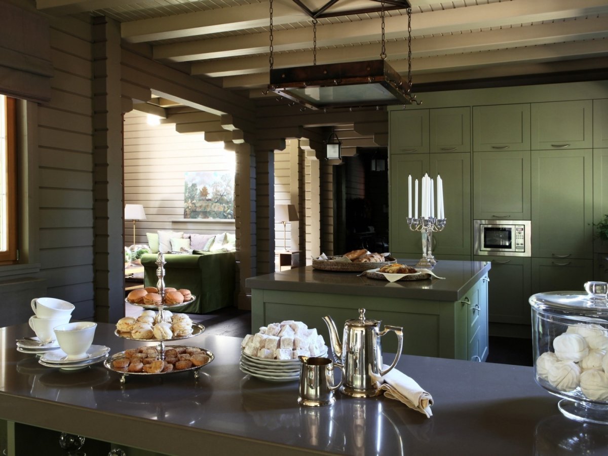 52. Зеленая кухня в деревянном доме