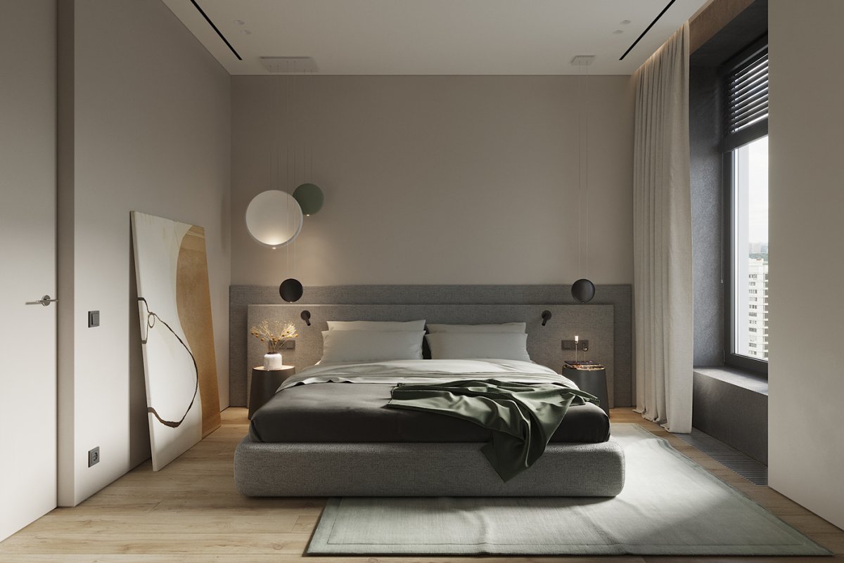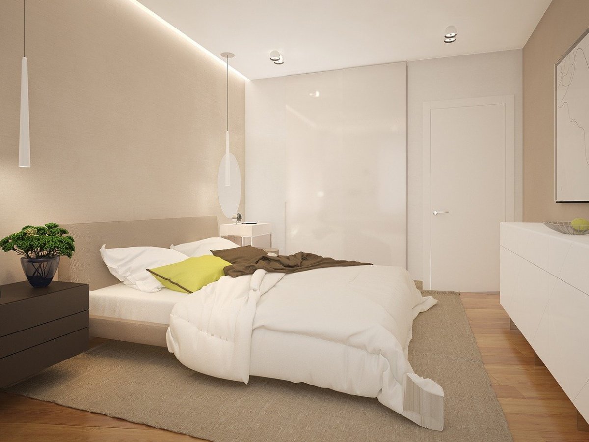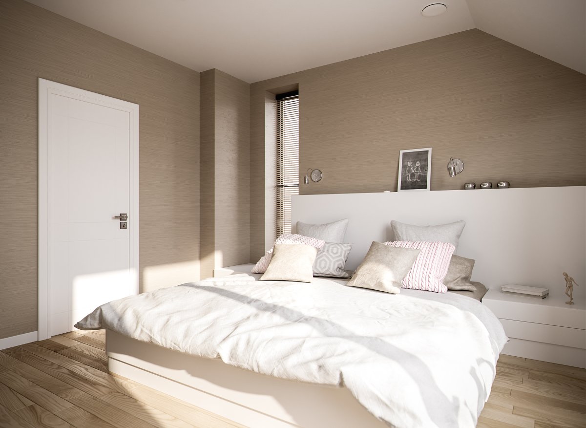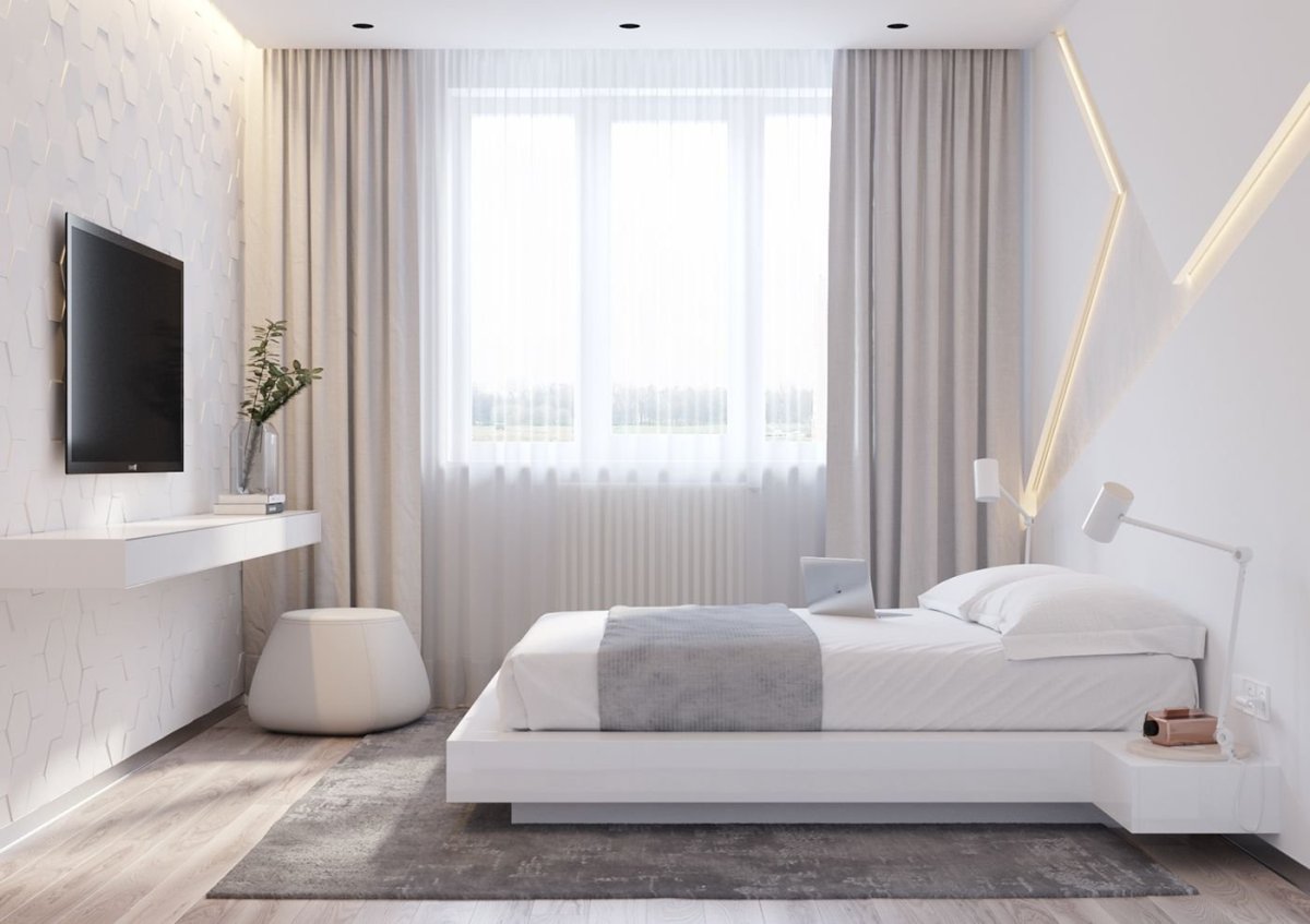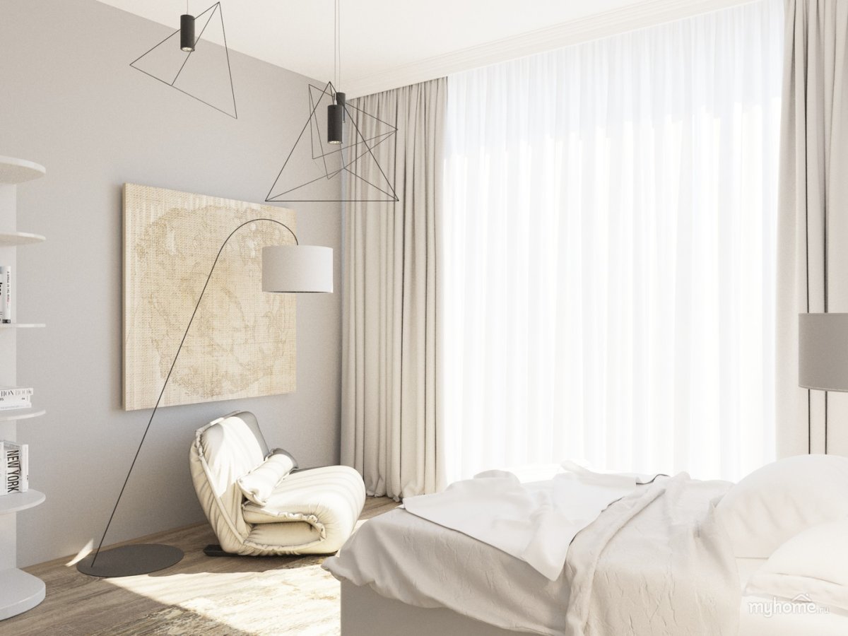 38. Спальня в светлых тонах с рабочим местом Минимализм