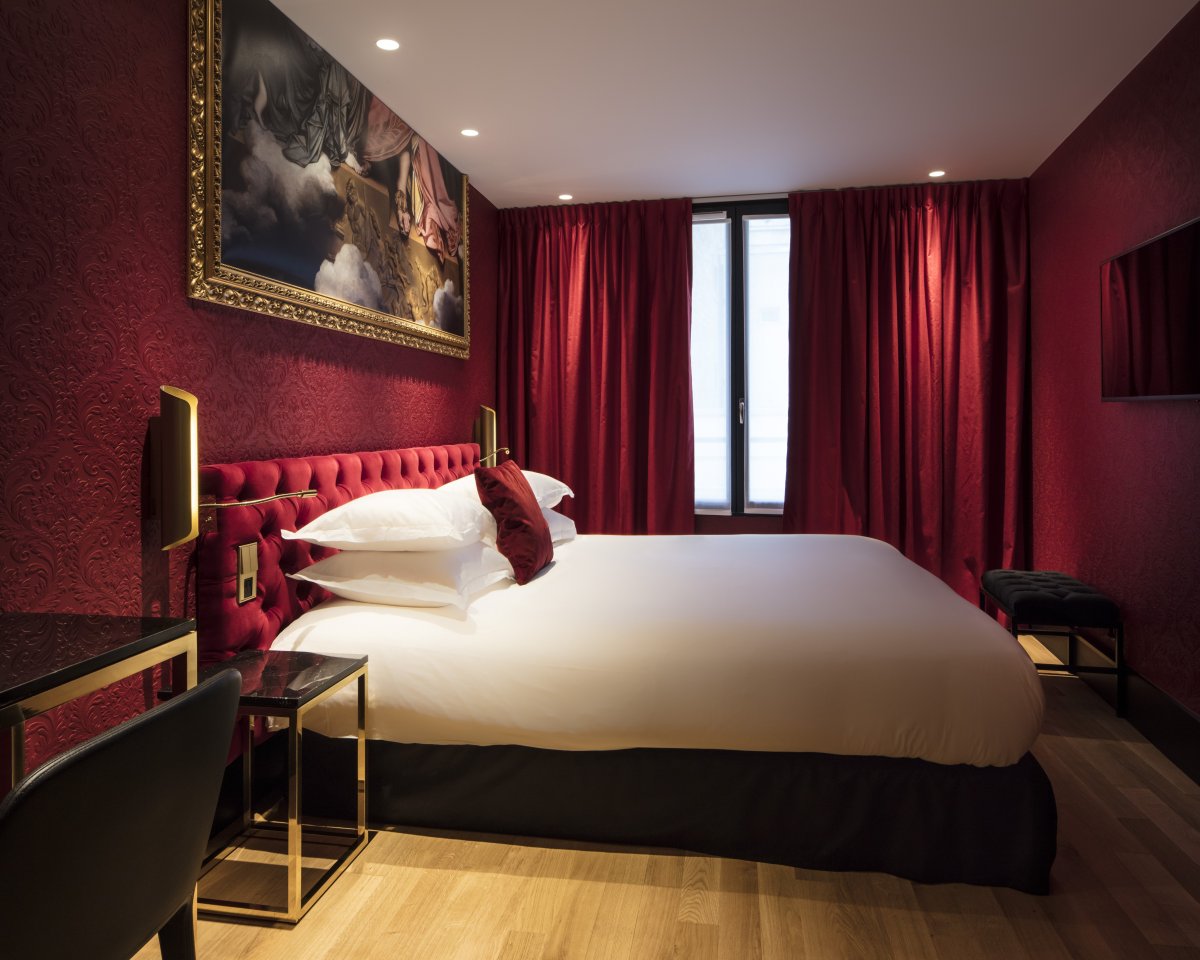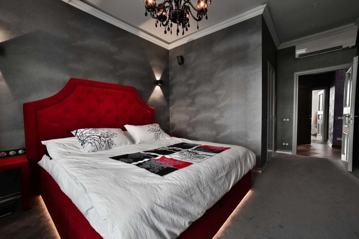63. Интерьер спальни с бра на стену цвета марсала и белый
