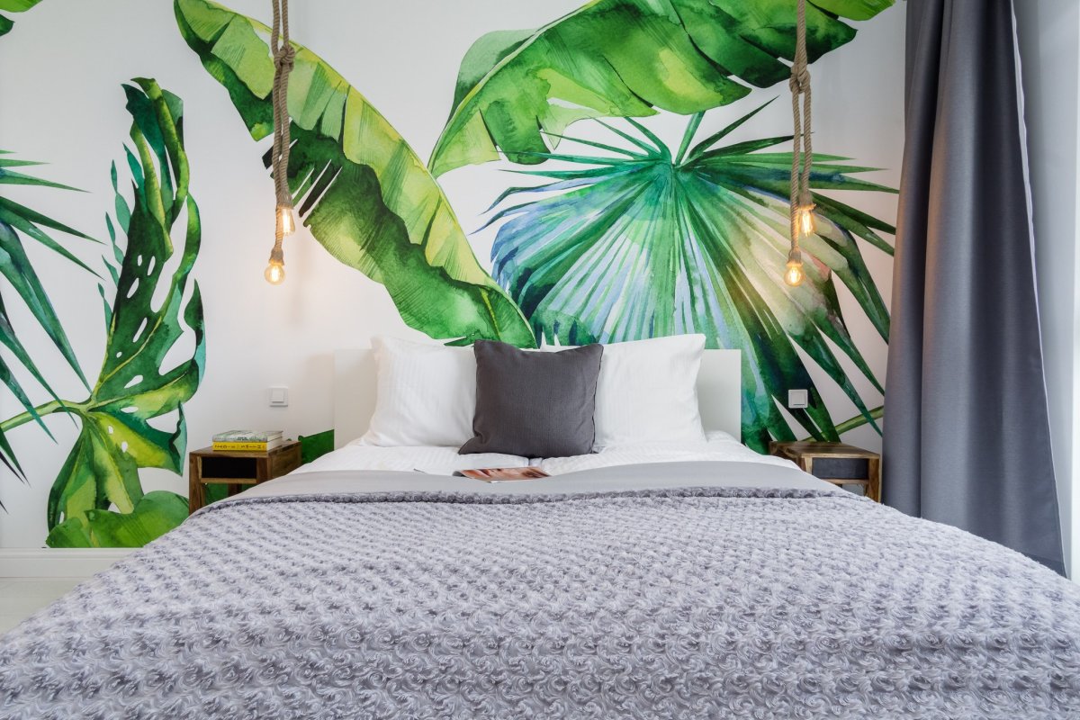 3. Тропические листья в интерьере спальни