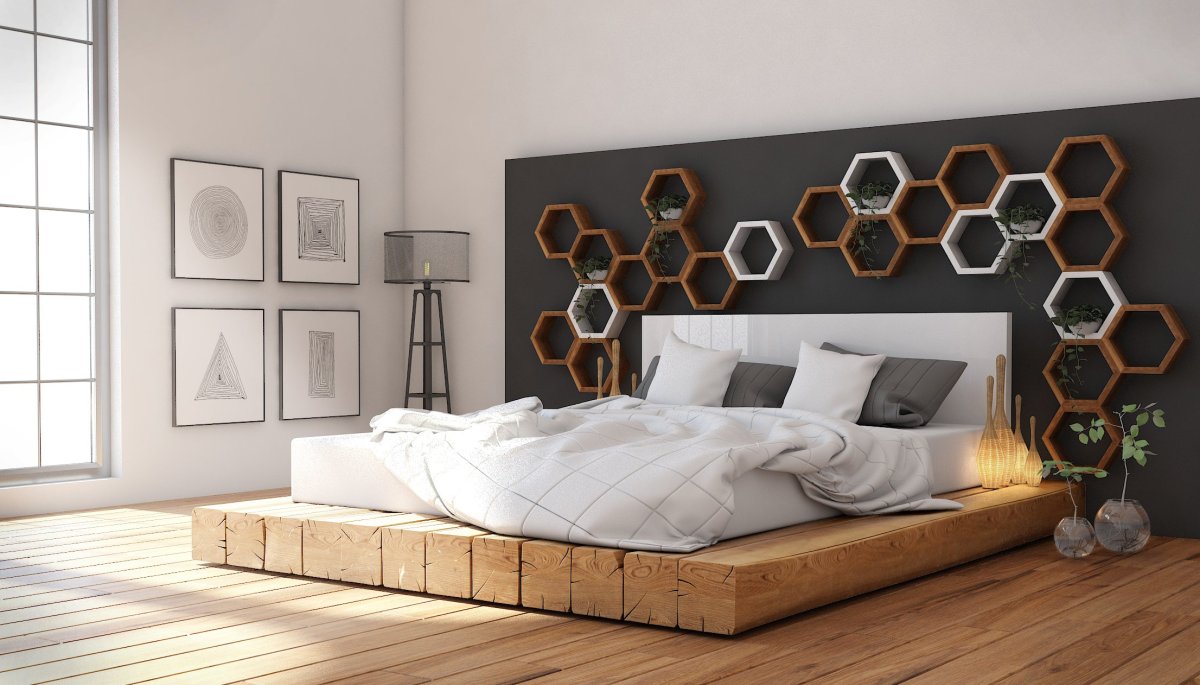 26. Полки соты в интерьере спальни