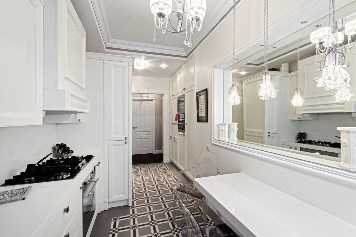 60. Белая кухня с зеркалами