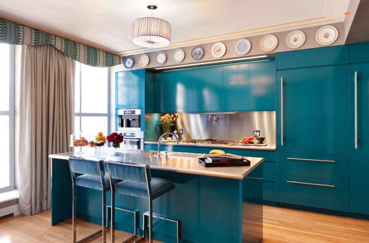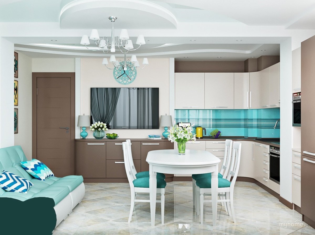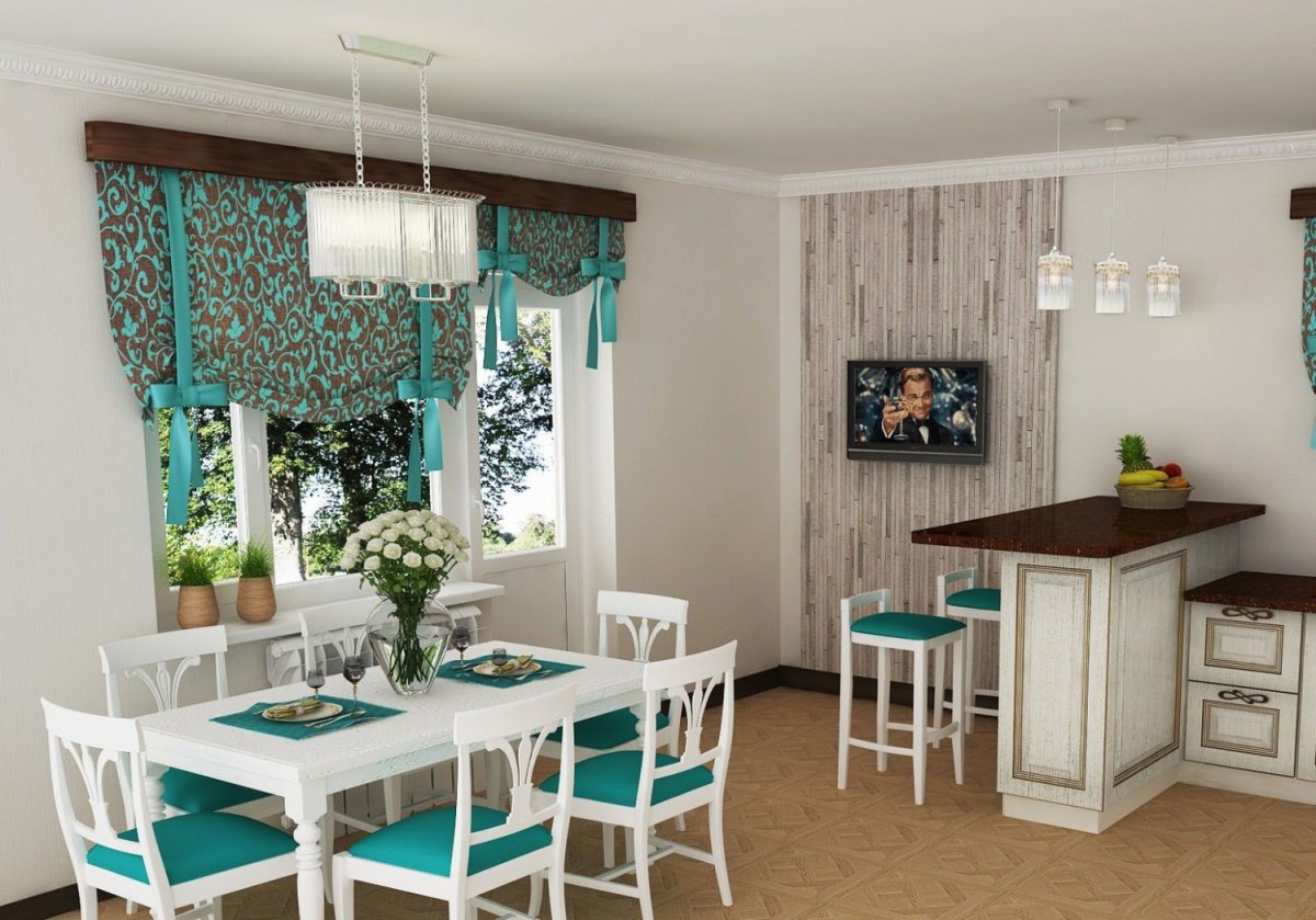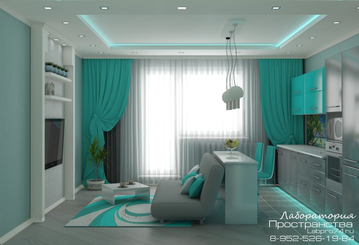 15. Дизайн кухни-гостиной 16 кв м с бирюзовыми шторами