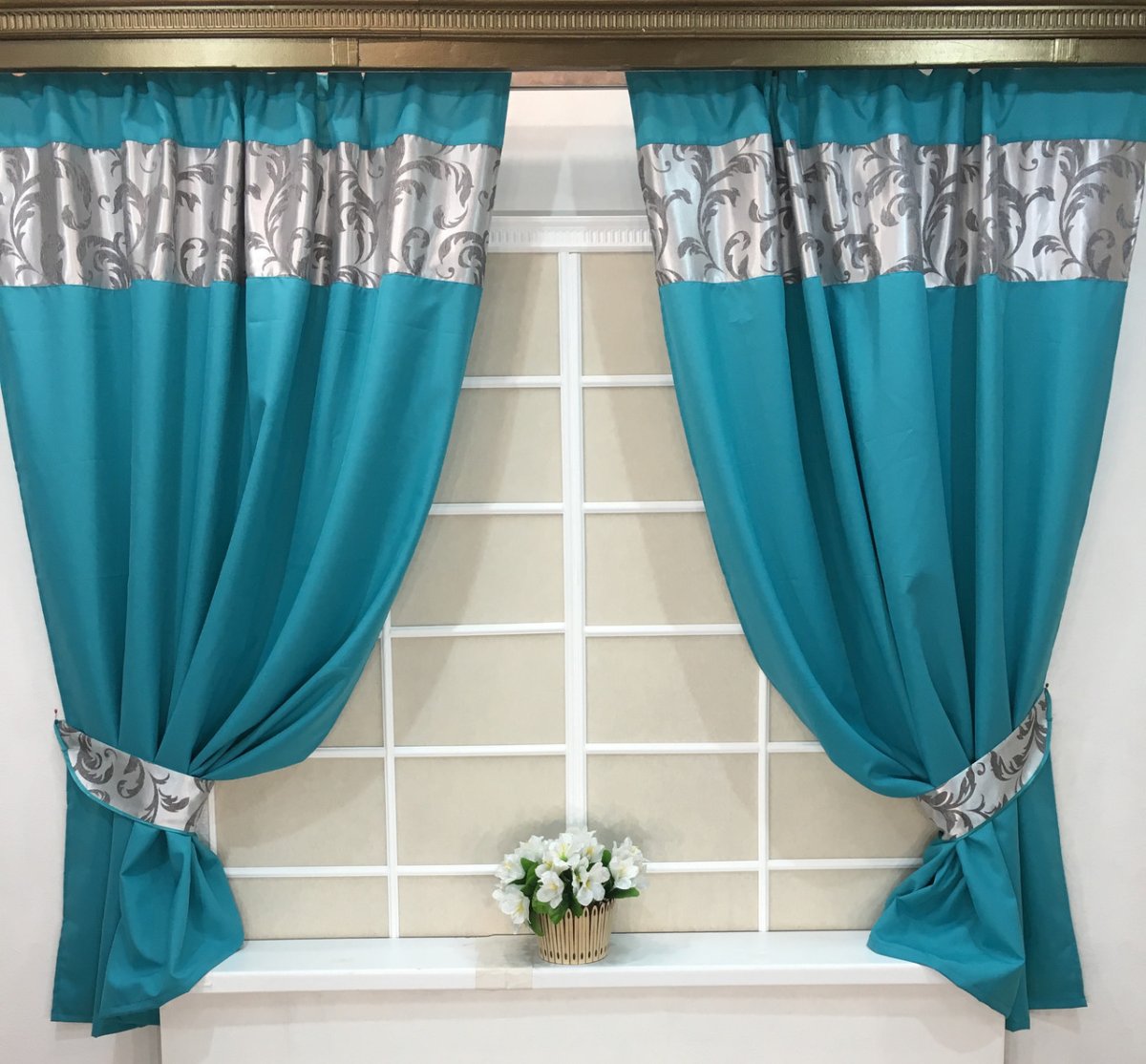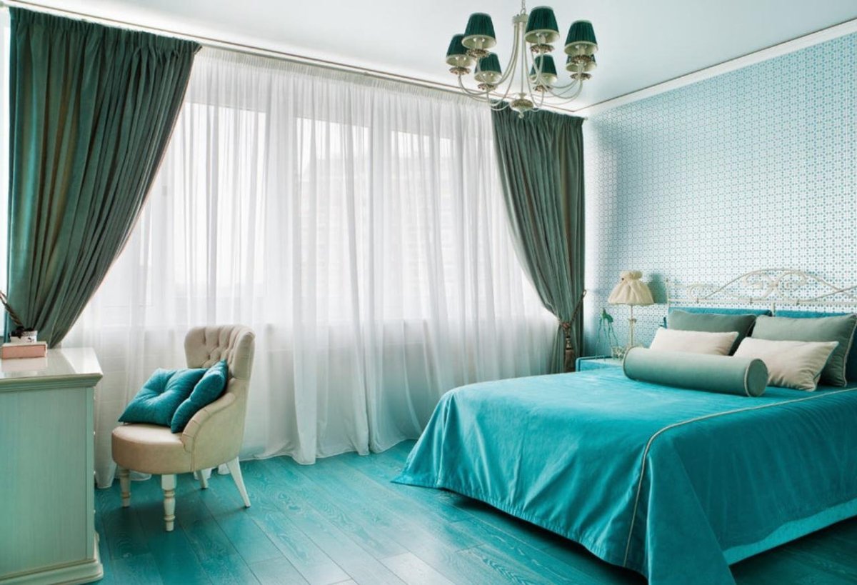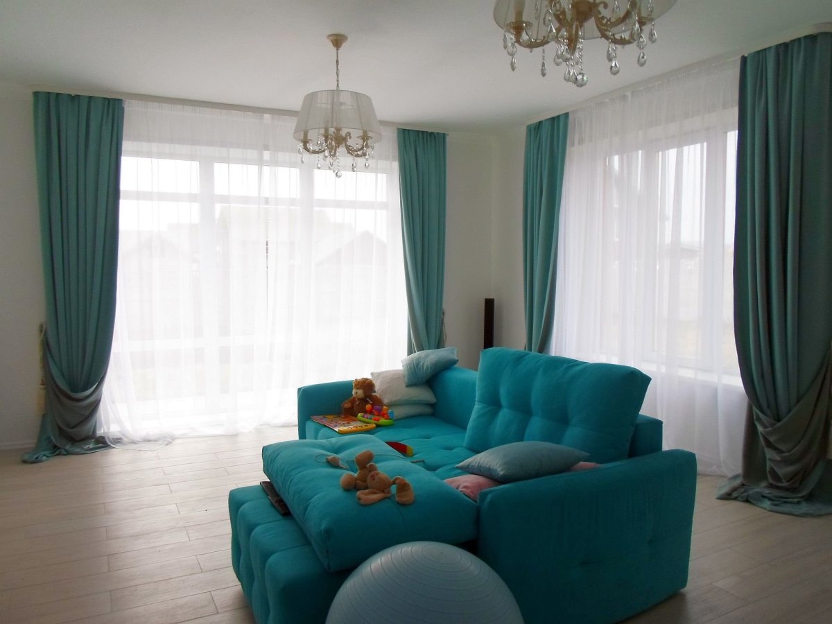 15. Дизайн кухни-гостиной 16 кв м с бирюзовыми шторами