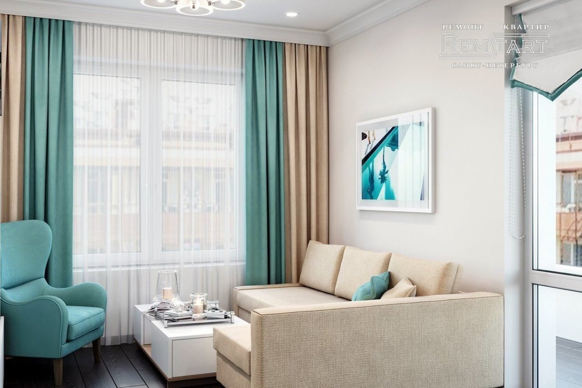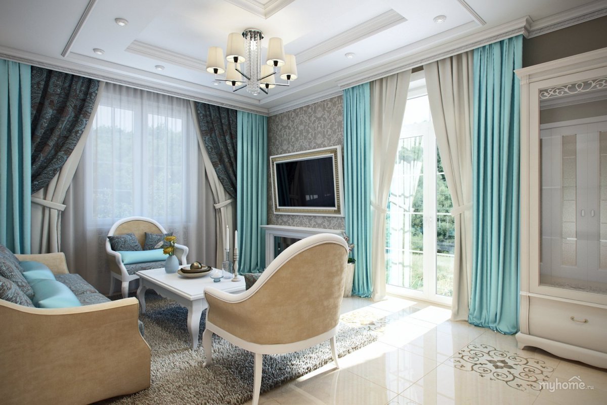 33. Бирюзовые шторы в интерьере гостиной в бежевых тонах