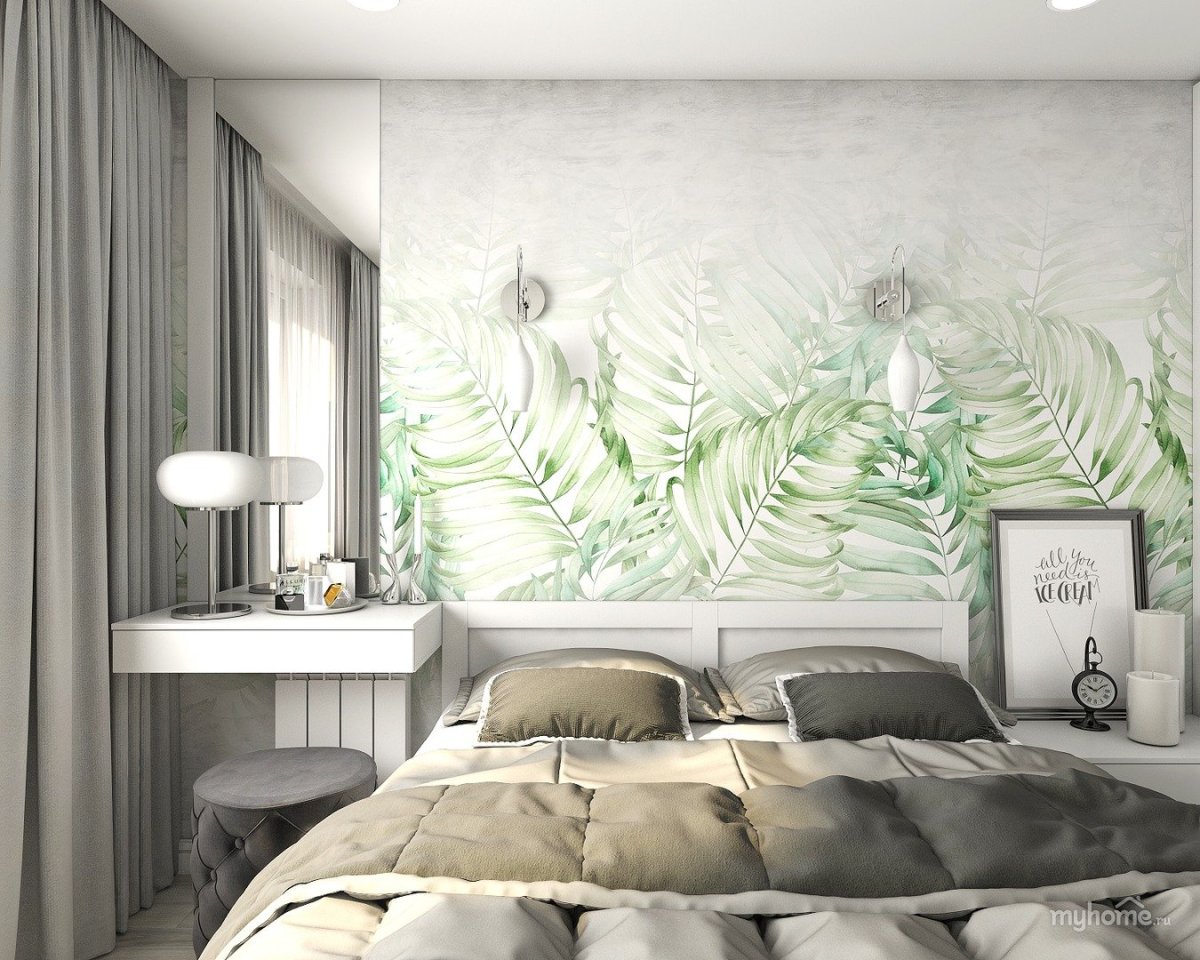 48. Обои с папоротником в интерьере спальни