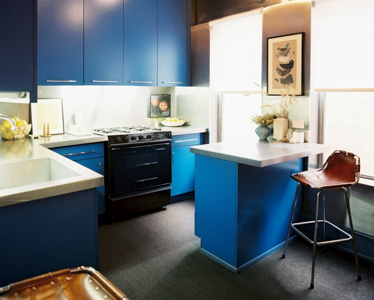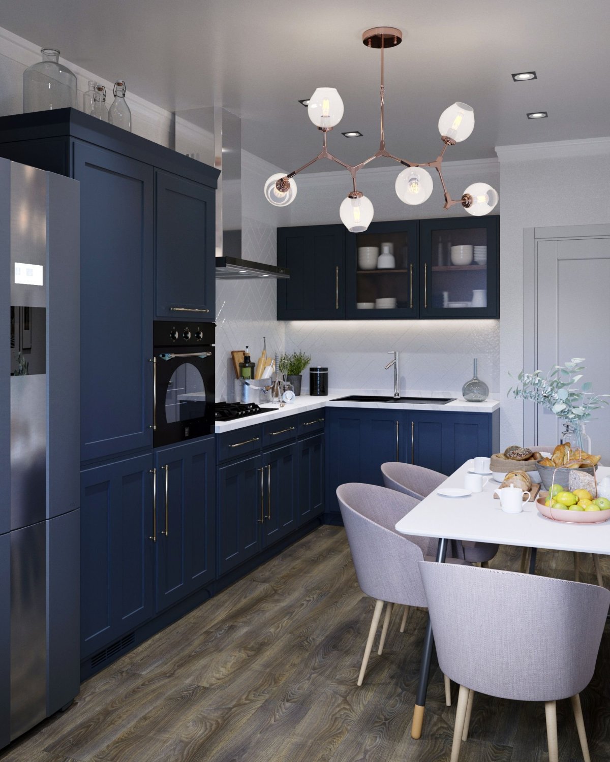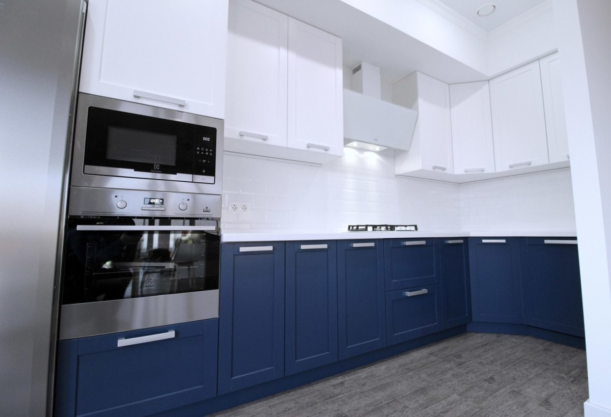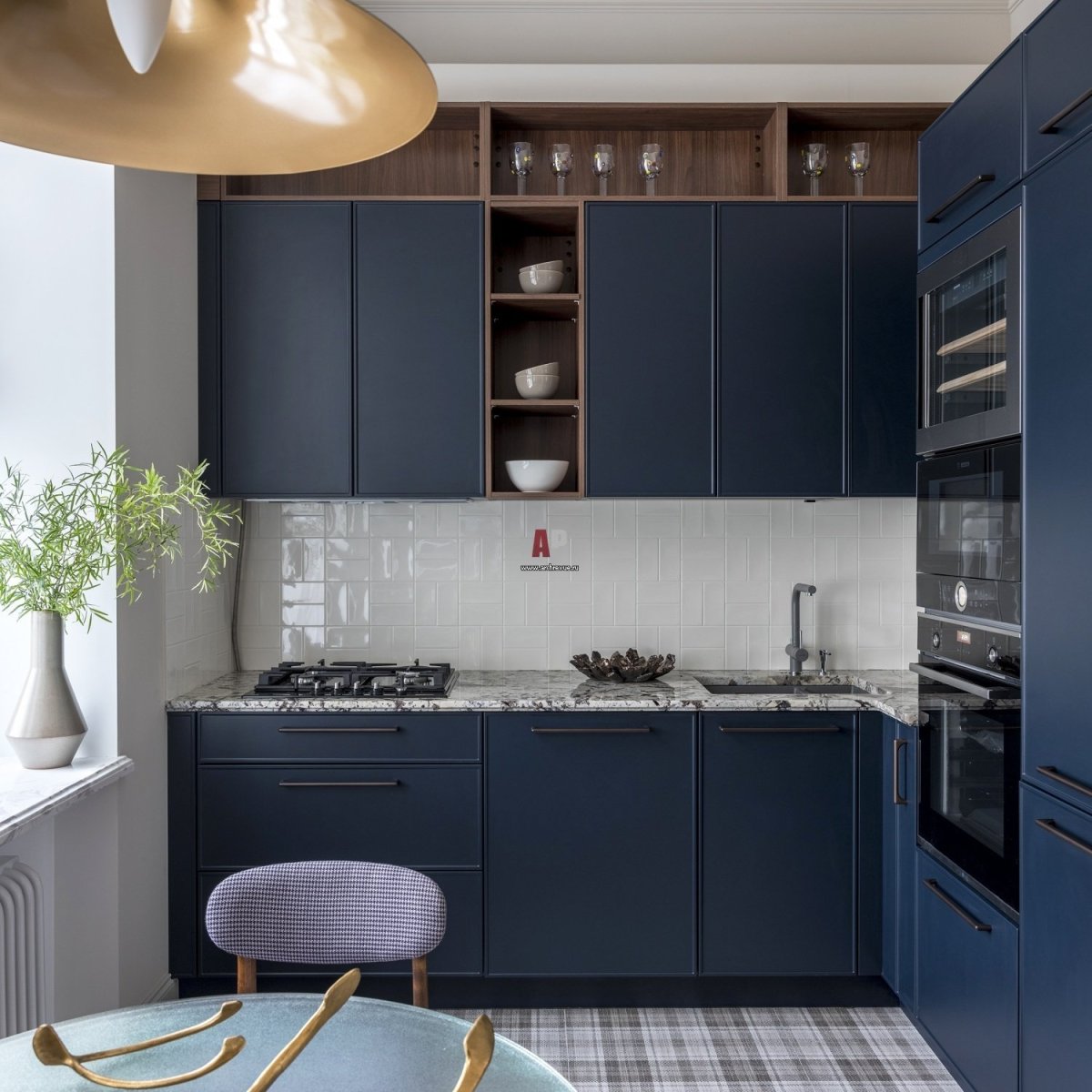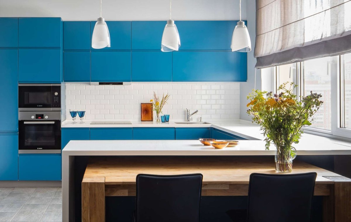 7. Обои на кухню под сине белый гарнитур дизайн 2022 фото новинки