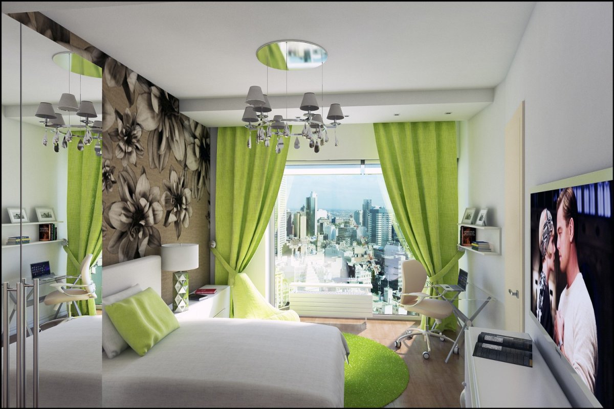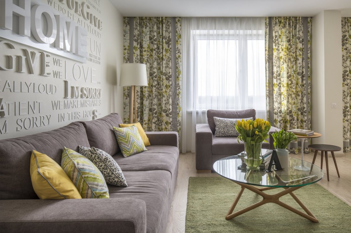 62. Салатовые шторы в интерьере маленькой гостиной комнаты