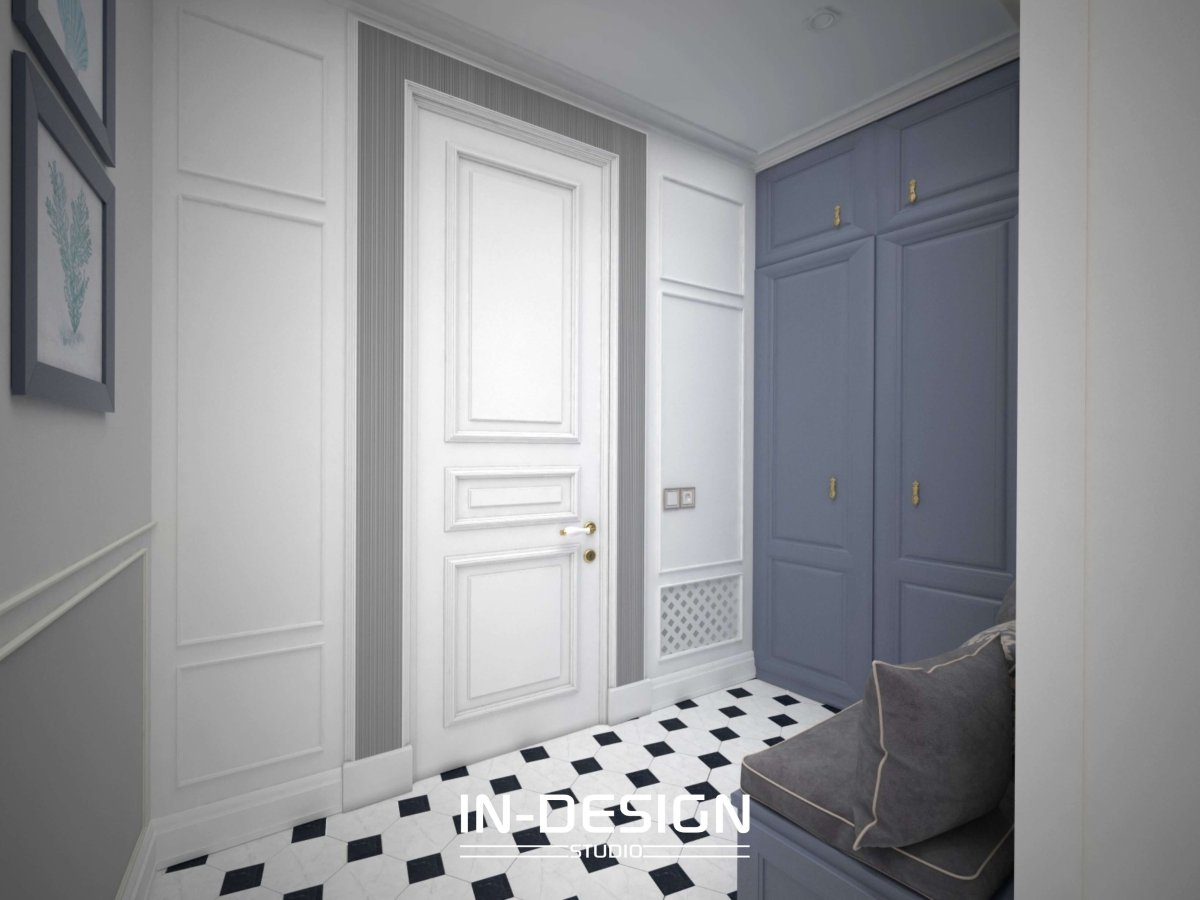 4. Прихожая в голубых тонах с белыми дверями