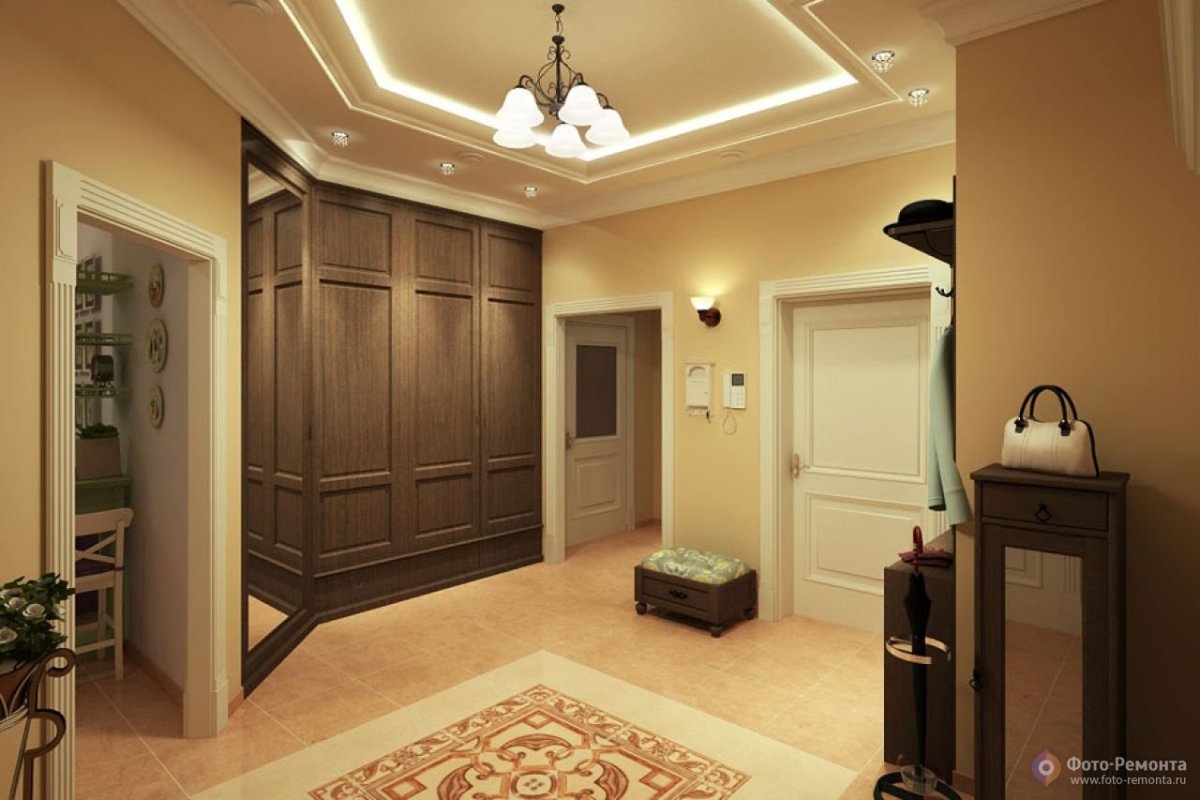 Фото: Дизайн квадратной прихожей с тремя дверыми проёмами
