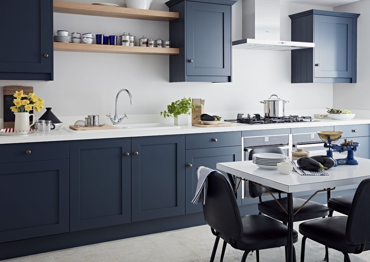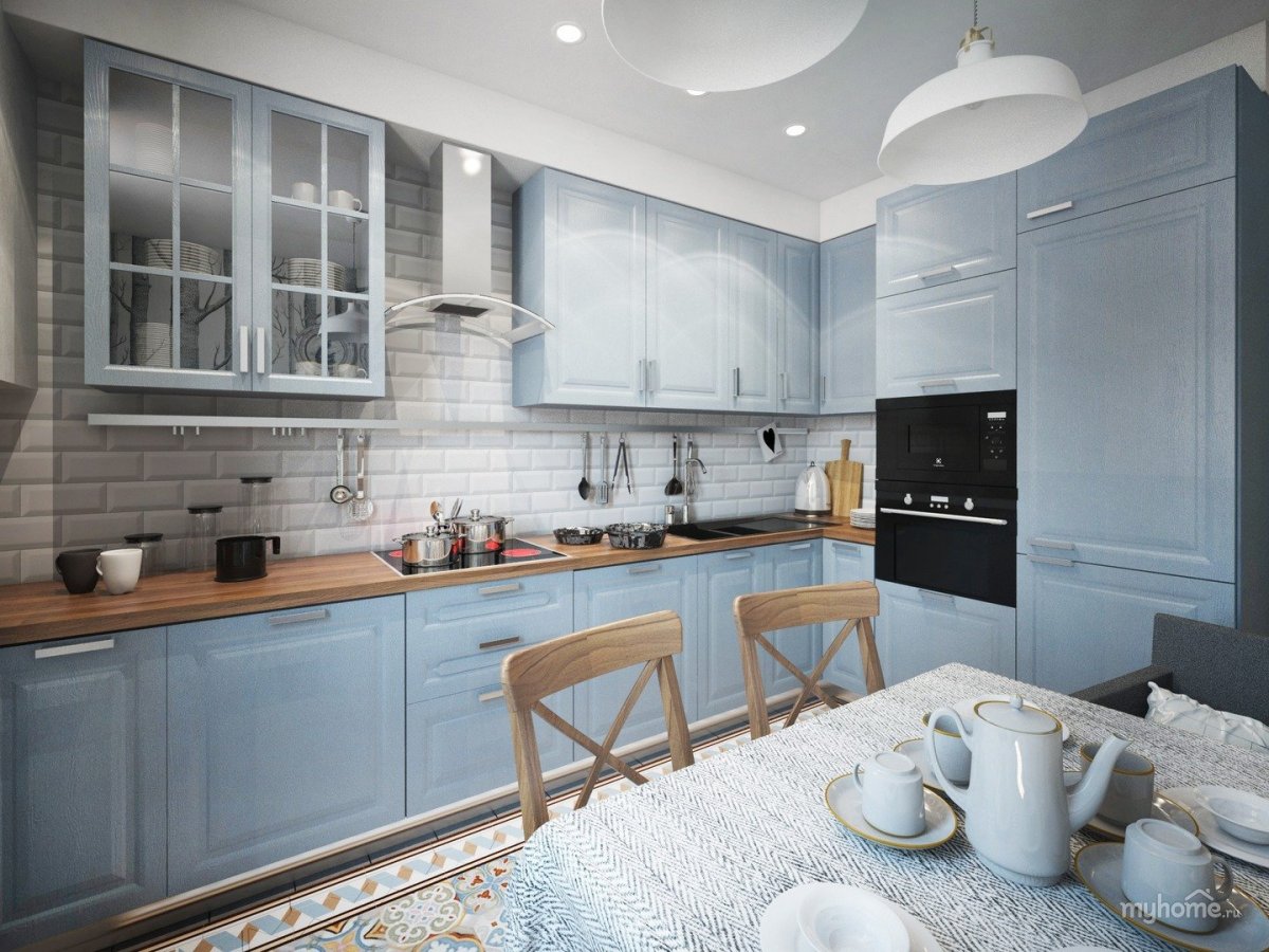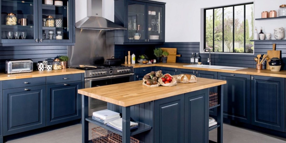30. Синяя кухня с деревянной столешницей и деревянными полами