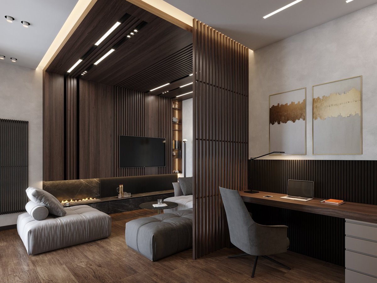 15. Кухня гостиная с деревянными рейками