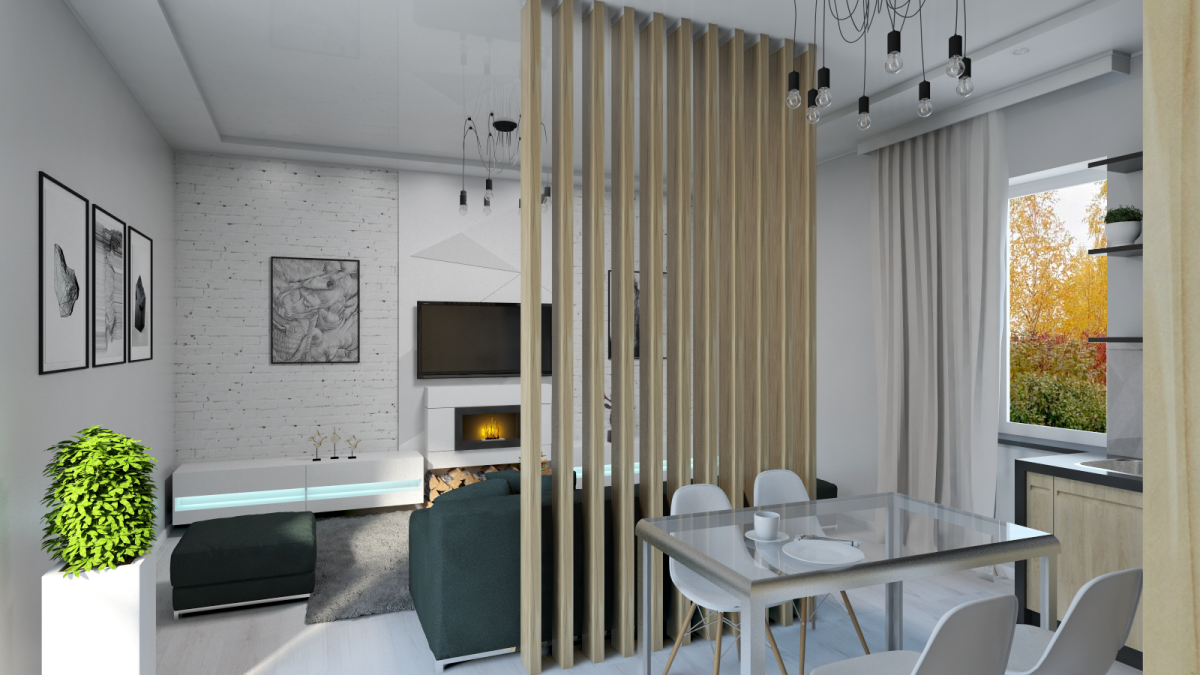 14. Кухня гостиная с реечной перегородкой