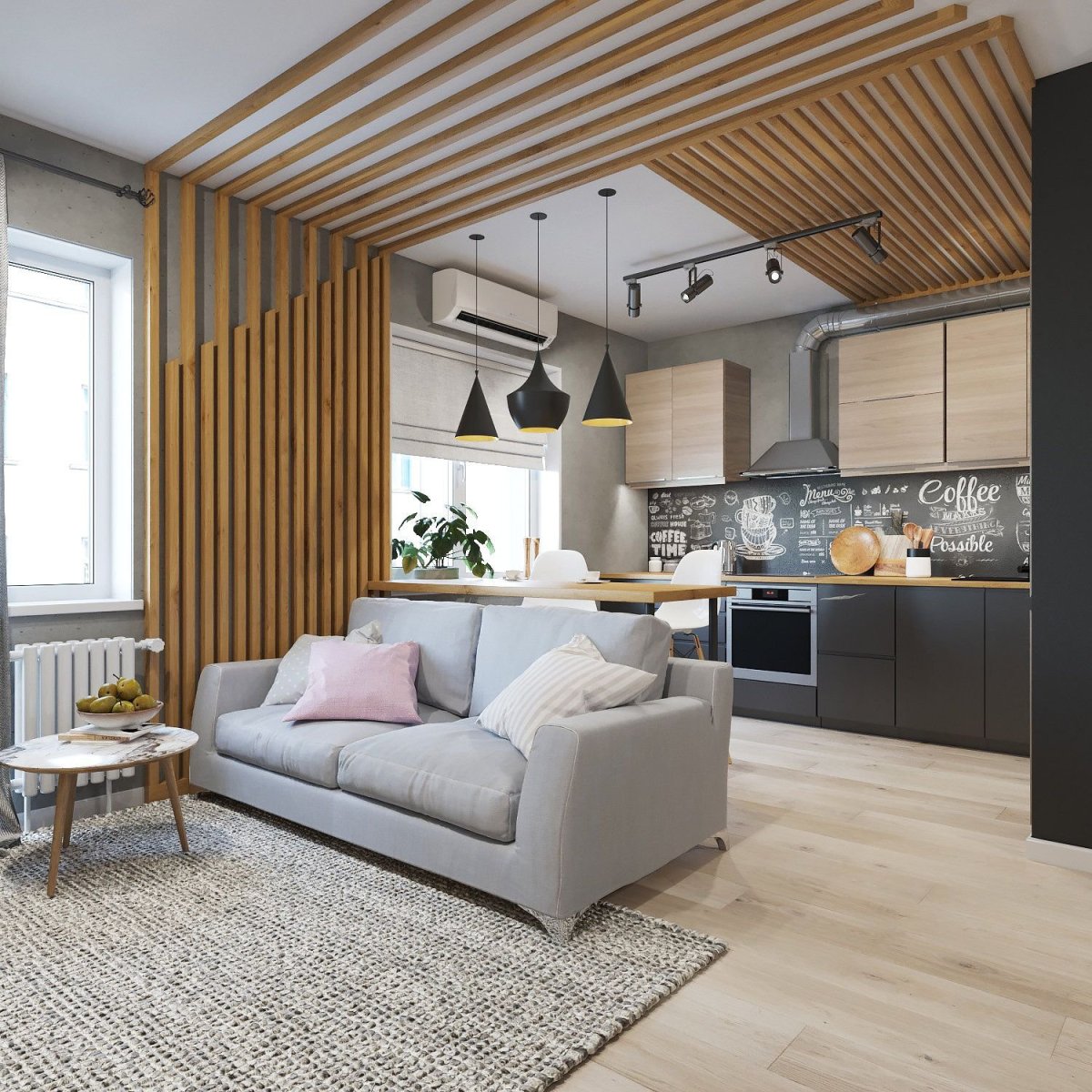10. Интерьер гостинной кухней с рейками