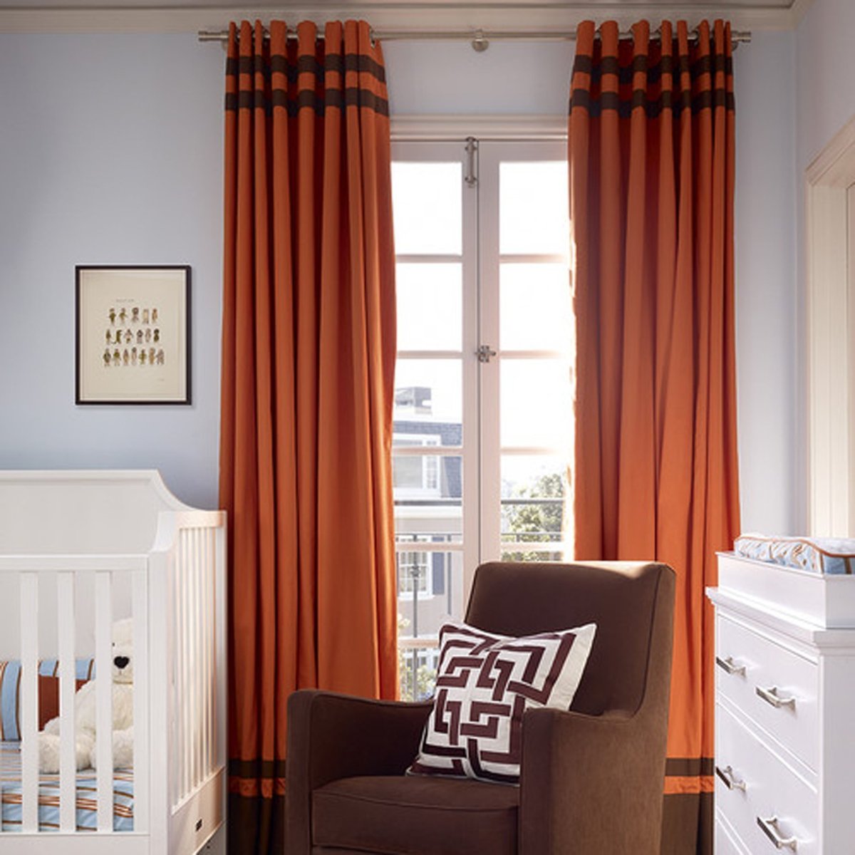 47. Оранжевые шторы в интерьере гостиной в бежевых