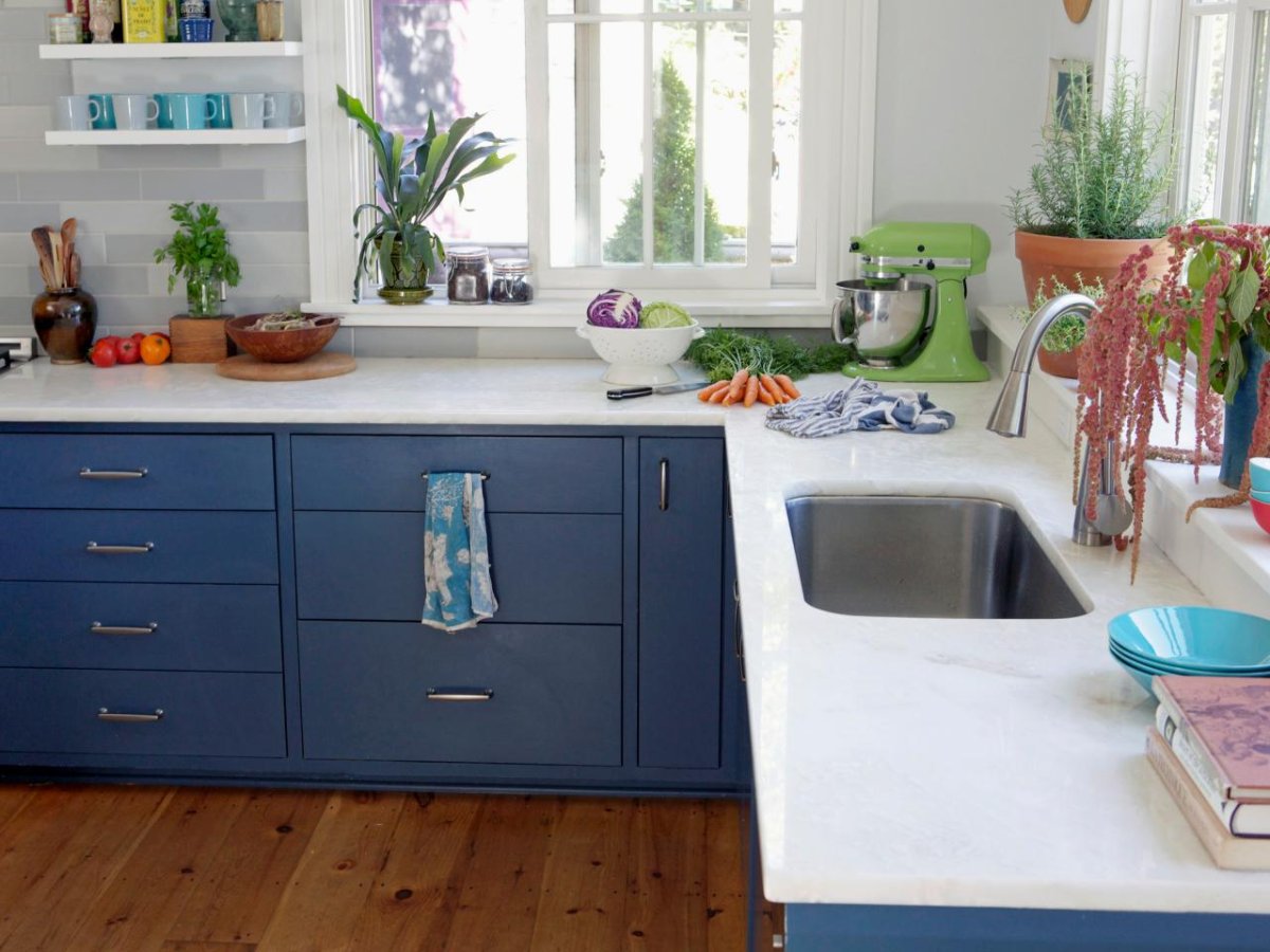 29. Синяя кухня с черной мойкой