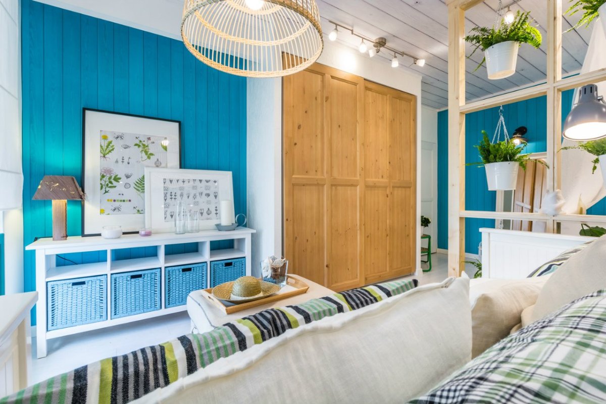 49. Голубая вагонка в интерьере гостиной