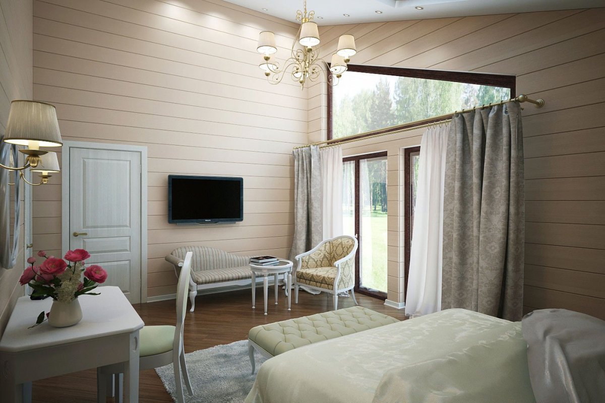 34. Спальня в деревянном доме вагонка