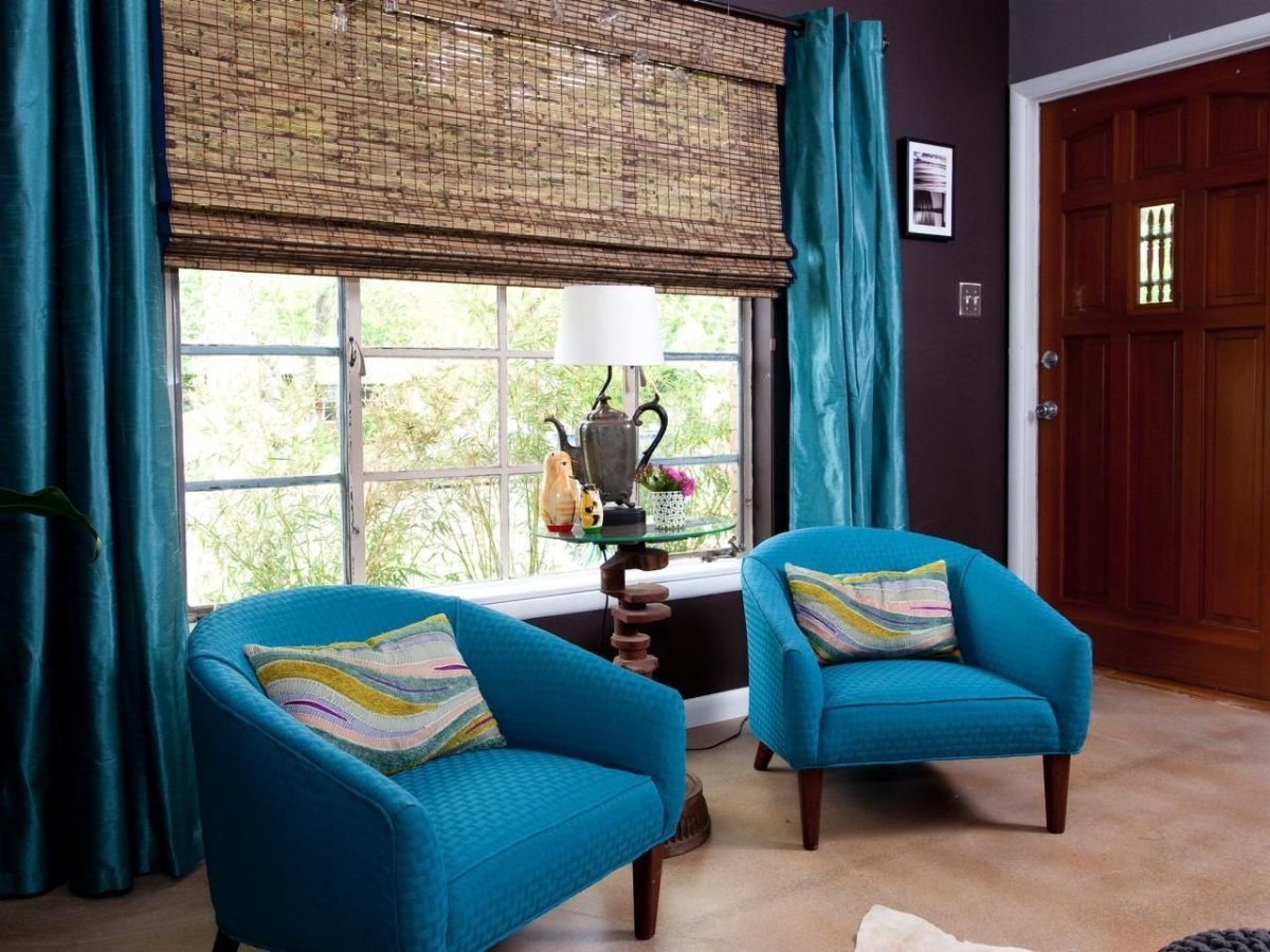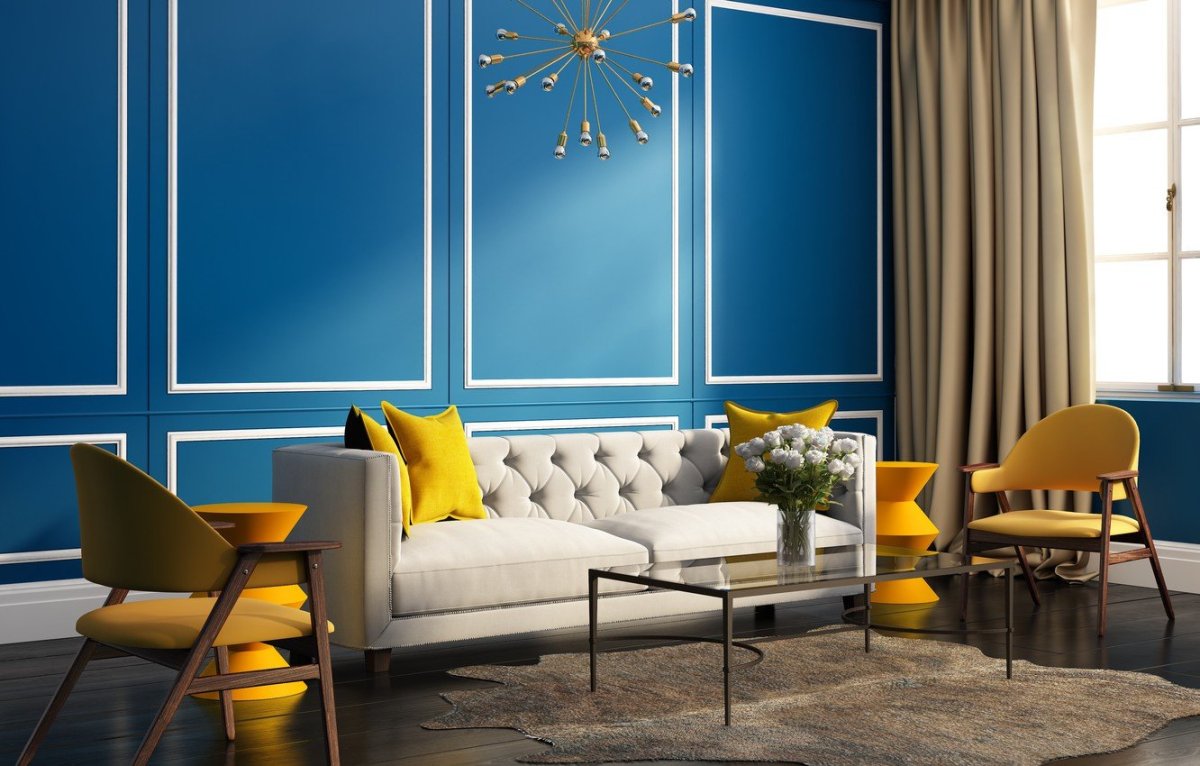 29. Дизайн гостиной в желто синих тонах с ТВ зоной