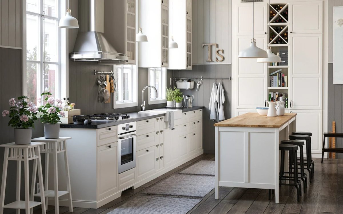 3. Белая кухня икеа Воксторп с деревянной столешницей