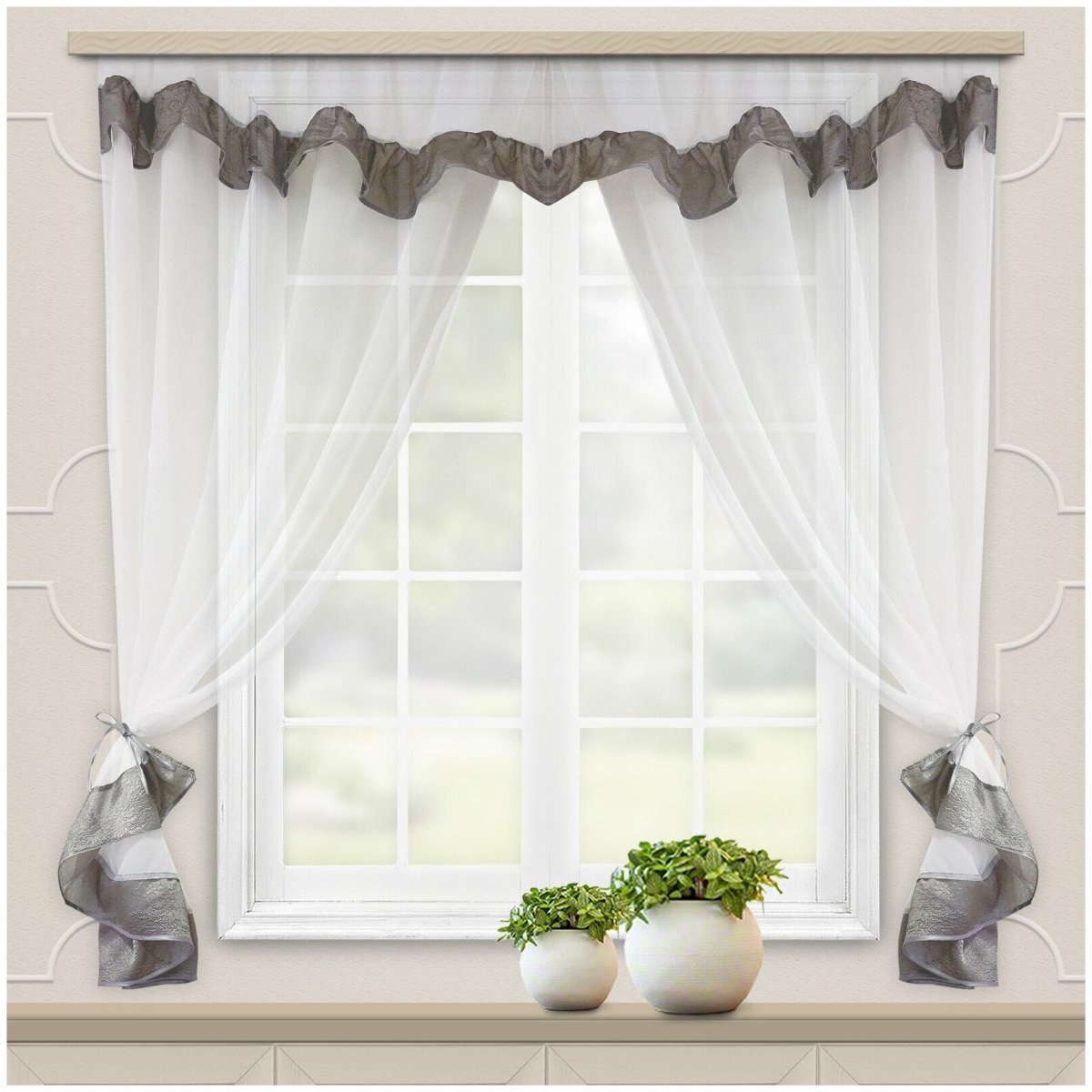14. Серый тюль с ламбрекеном на кухню