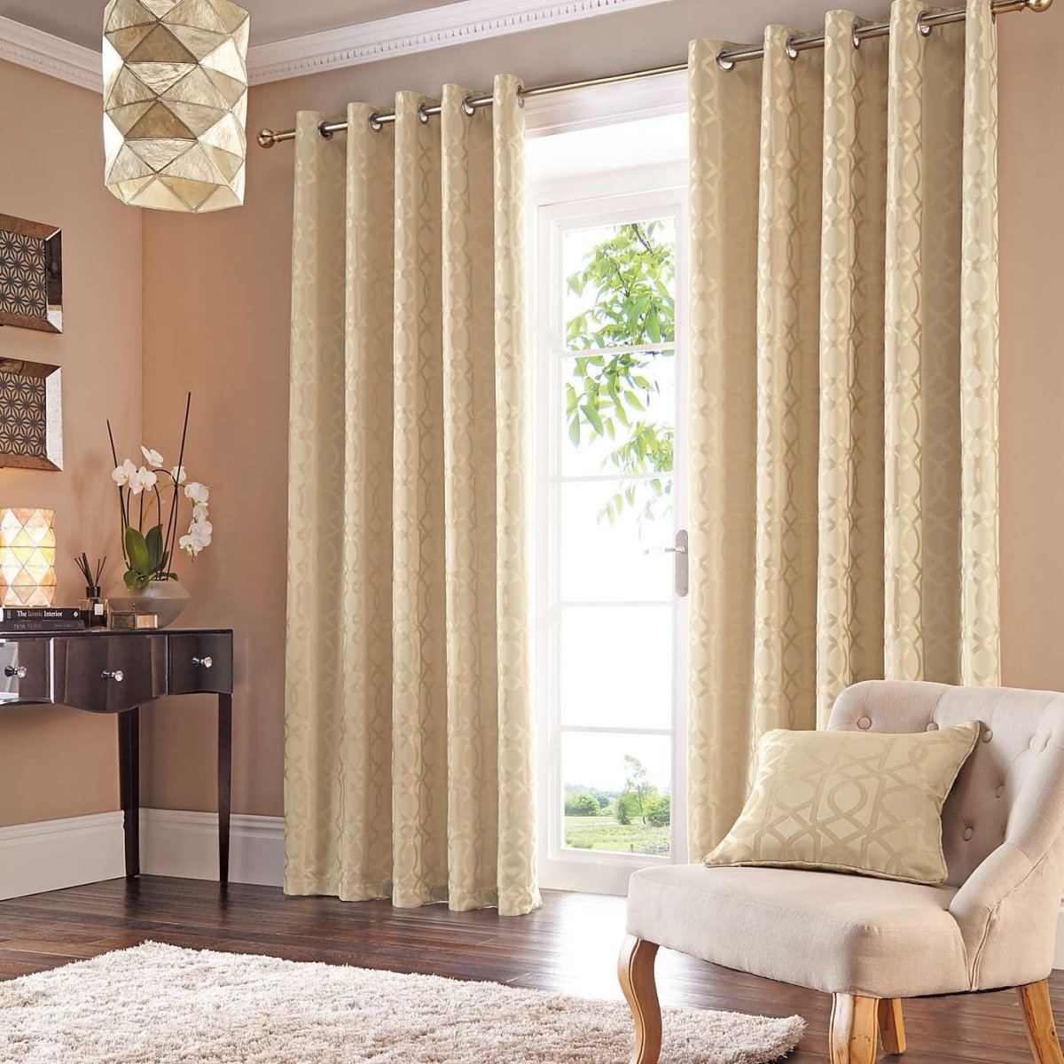 20. Бежево золотистые шторы в интерьере