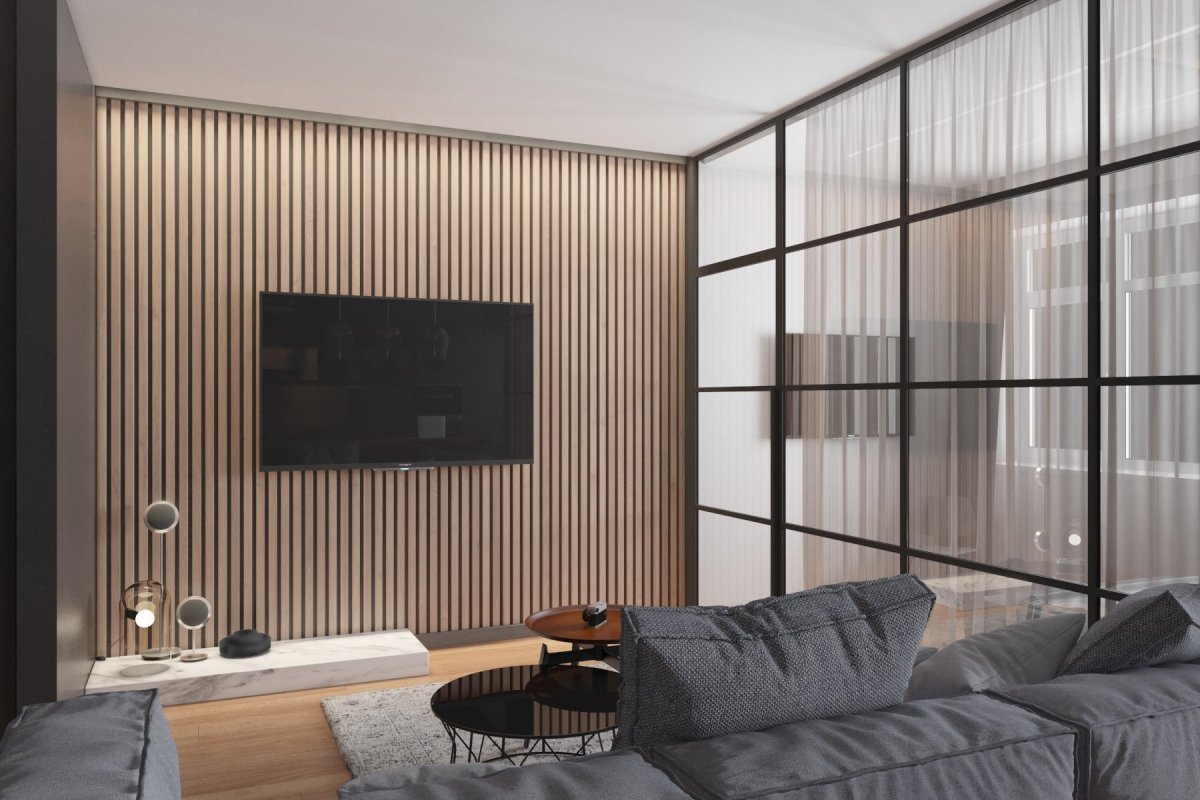 30. Реечные перегородки для зонирования в интерьере гостиной-спальни