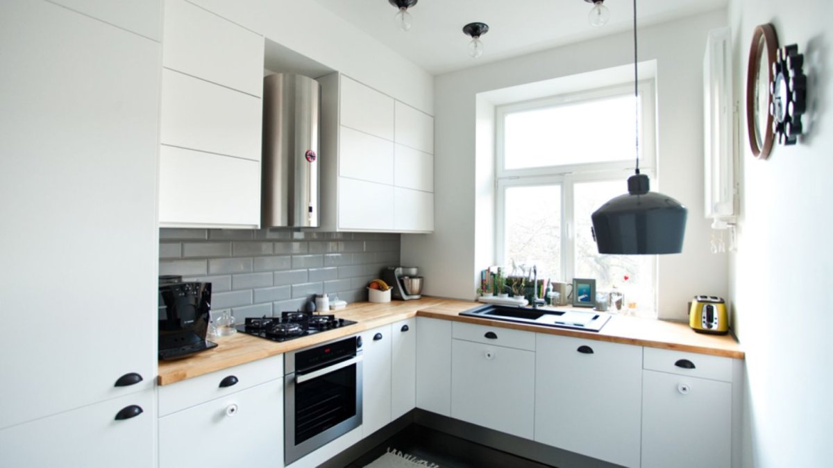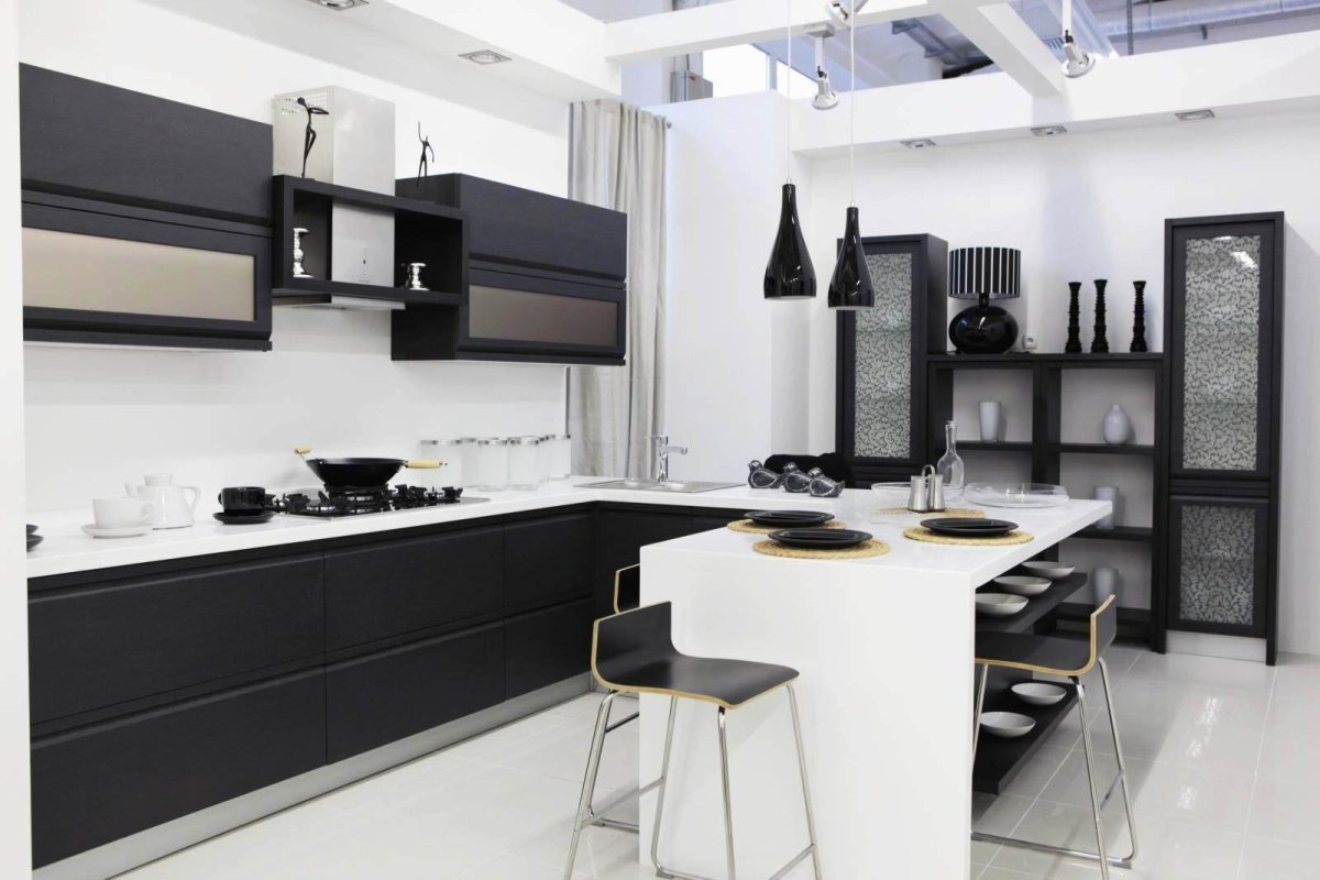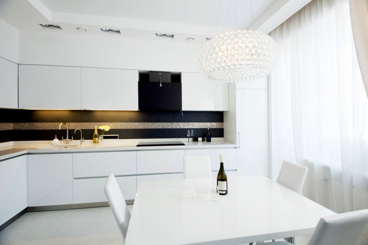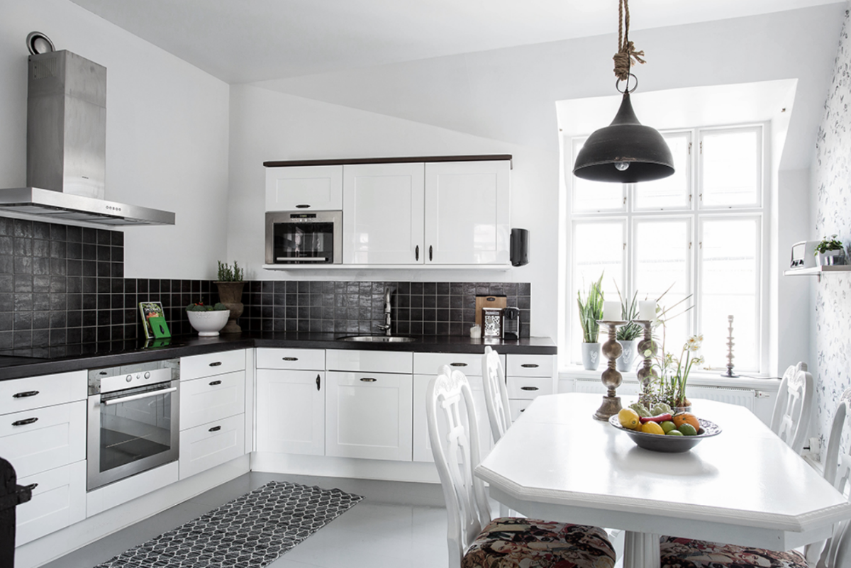 40. Белая кухня с черной столешницей в скандинавском стиле